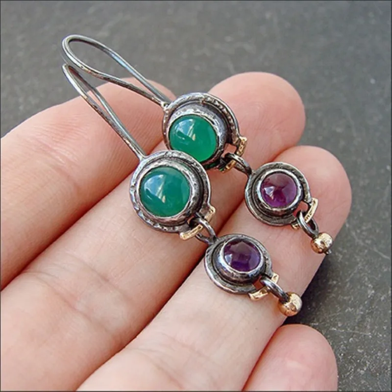 Женские серьги-подвески с натуральным Изумрудом и фиолетовым аметистом
