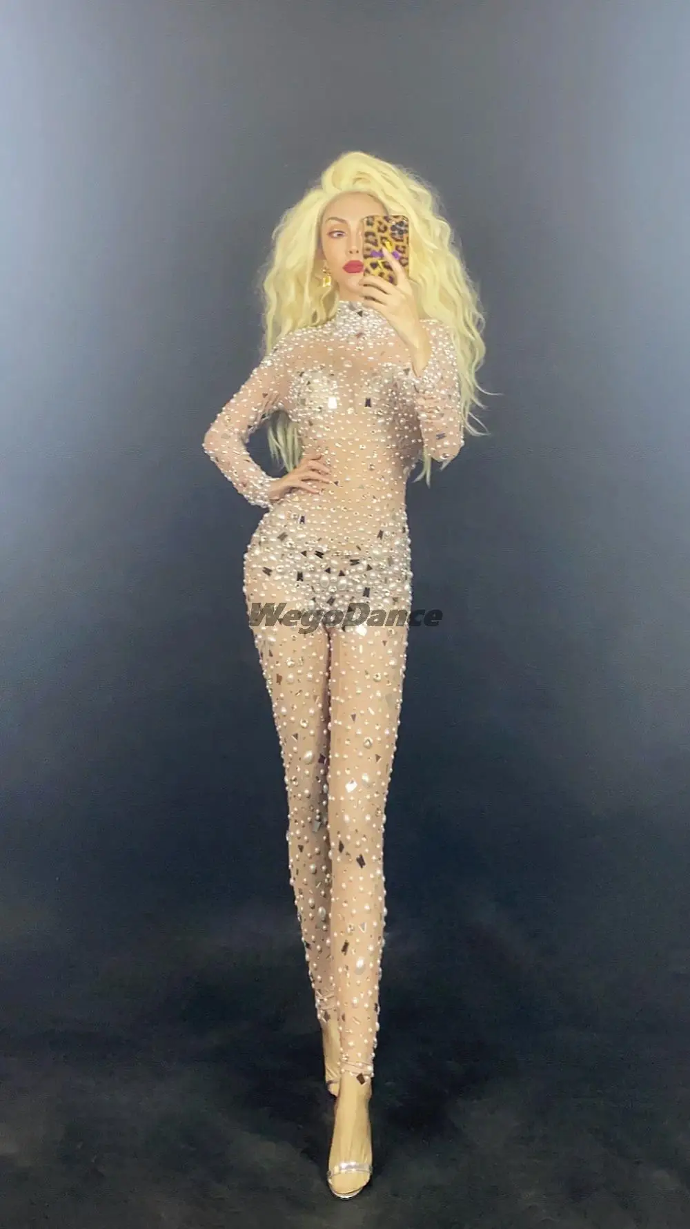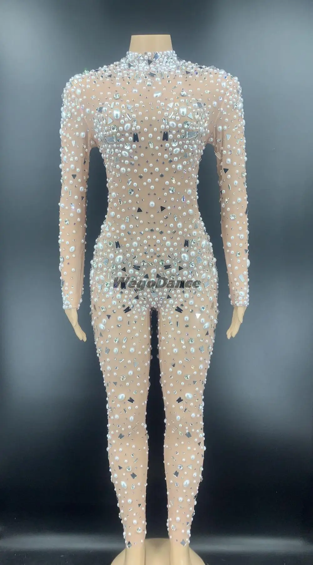 Сексуальный сценический комбинезон серебряное зеркало стразы жемчуж...