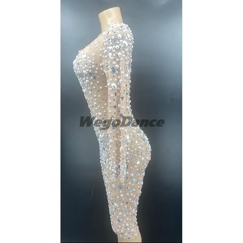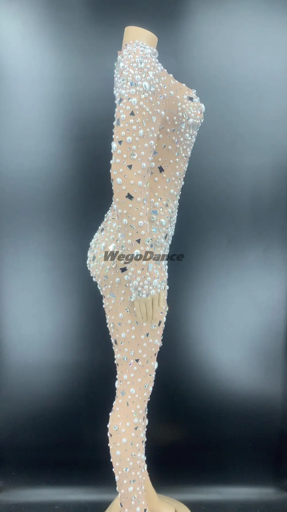 Блестящее серебряное зеркало Стразы Жемчуг прозрачный комбинезон Де...