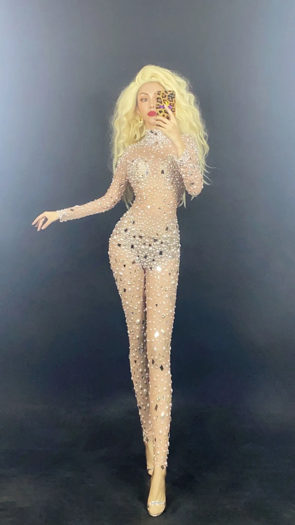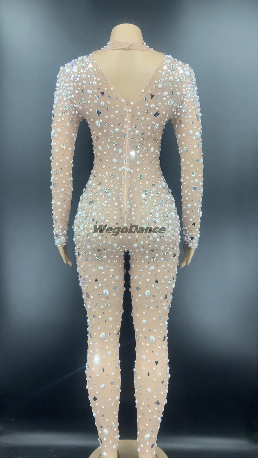 Роскошный прозрачный комбинезон с жемчугом и зеркалами, Женский веч...