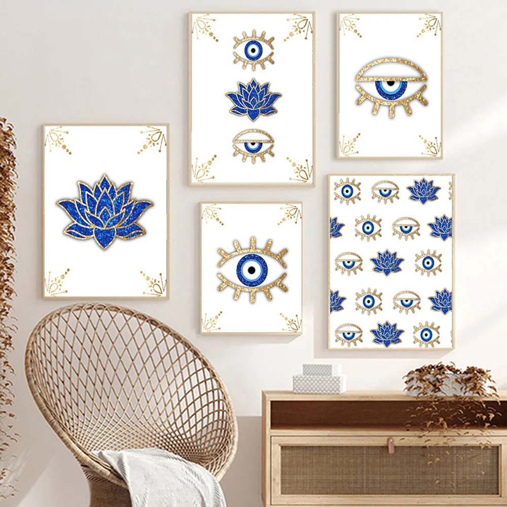 Золотистый синий Розовый Блестящий Лотос от сглаза настенная Картина на холсте скандинавские постеры и искусства для гостиной в стиле бохо Декор для комнаты
