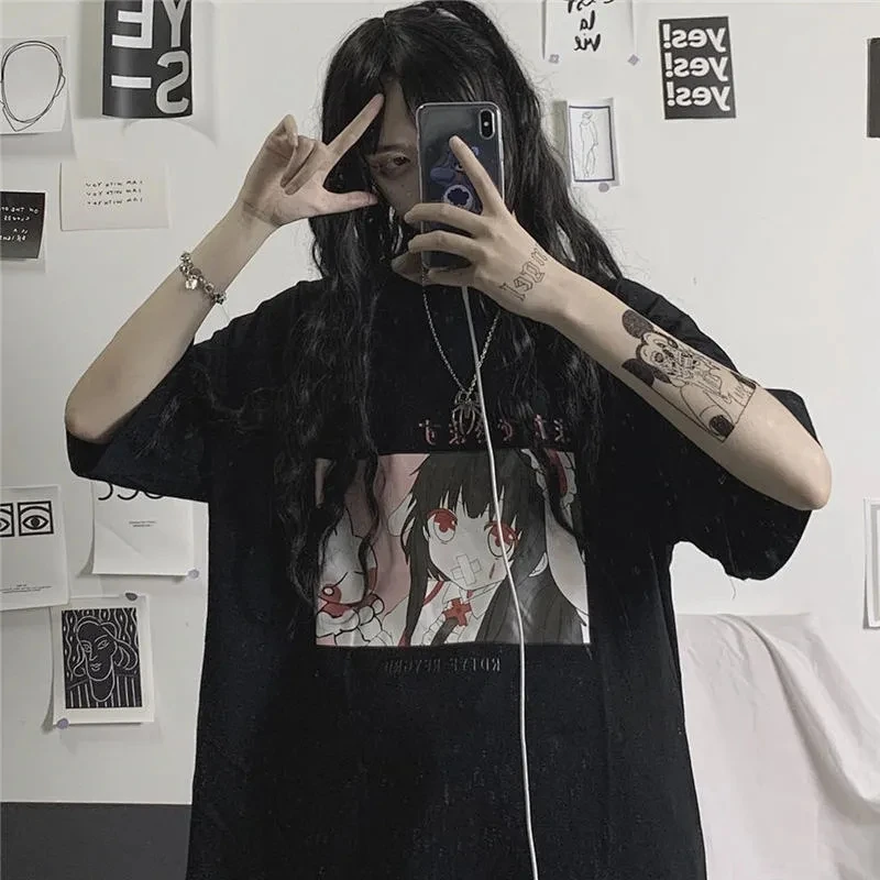 Harajuku, Корейская Футболка, женская, унисекс, аниме, кролик, модная, милая, эстетическая, гранж, черная футболка, сатанитская, готическая одежда, рубашка, черные топы