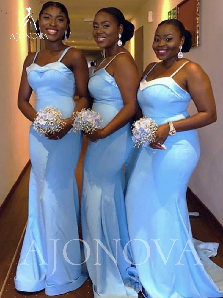 Небесно-Голубые атласные платья свидетельницы для женщин 2021 Элегантное свадебное вечернее платье Русалка на тонких бретельках для подружек невесты