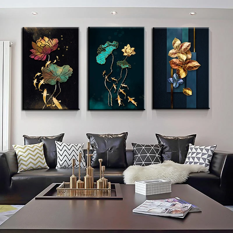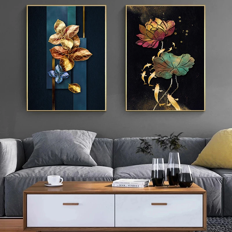 Роскошный абстрактный лист лотоса золотистый темный фон холст картина настенные картины постер Куадрос гостиная украшение для дома