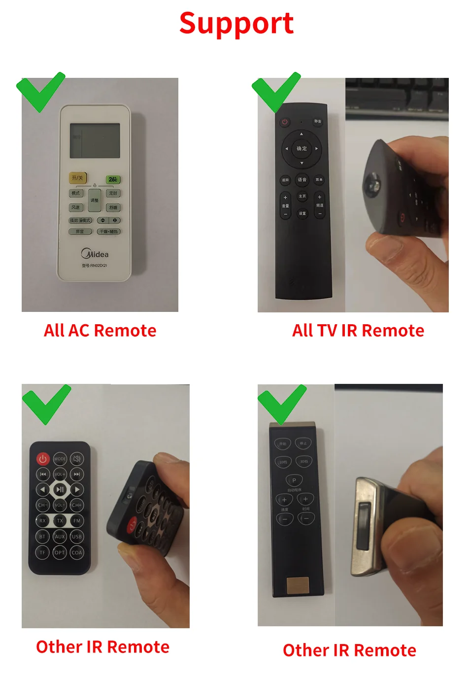 Умный ИК и Радиочастотный пульт поддерживает все инфракрасные пульты и не скользящие радиочастотные пульты кодирования.Но обратите внимание, что пульты 2,4G и Bluetooth Пульты не поддерживаются.Советы:1. Инфракрасный пульт дистанционного управления оснащен инфракрасной светоизлучающей трубкой, или инфракрасная светоизлучающая трубка защищена черным прозрачным окном.2. Длительное нажатие на инфракрасный пульт дистанционного управления для запуска бытовой техники, функция длительного нажатия не поддерживается, другие функции поддерживаются.3. Рулонное кодирование радиочастотных пультов не поддерживается. Вообще говоря, пульт дистанционного управления с кодом качения имеет функцию: нажмите на Радиочастотный пульт дистанционного управления один раз, световой светильник пульта дистанционного управления будет мигать несколько раз.