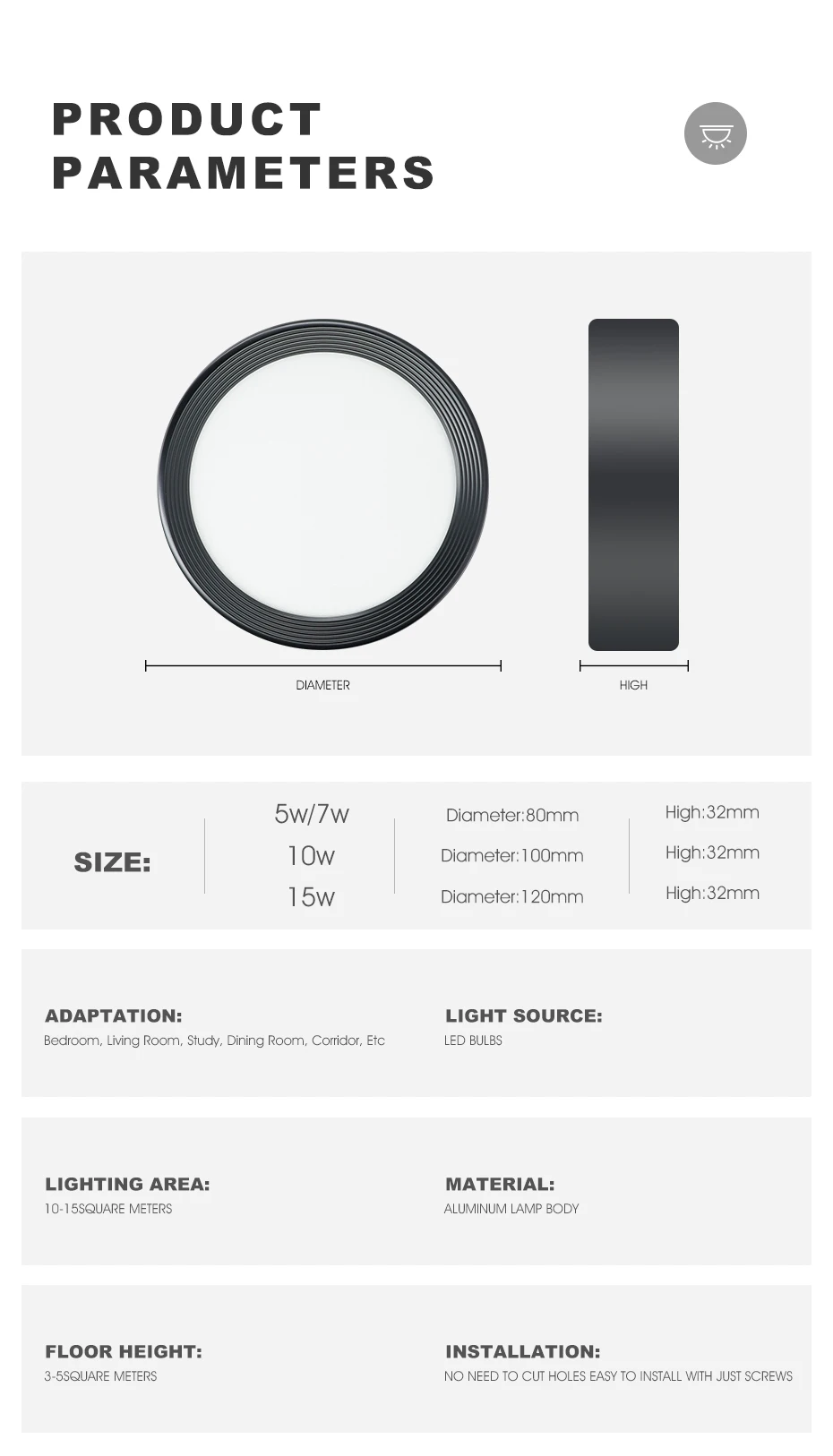 • Ультра-тонкий дизайн: неглубокий тонкий корпус лампы обеспечивает свободное пространство, отсутствие давления в пространстве, так же тонкий, как и 3 см. Каждое небольшое изменение-это стремление к созданию пространства для жизни, каждый миллиметр сокращения означает достаточное ощущение пространства.