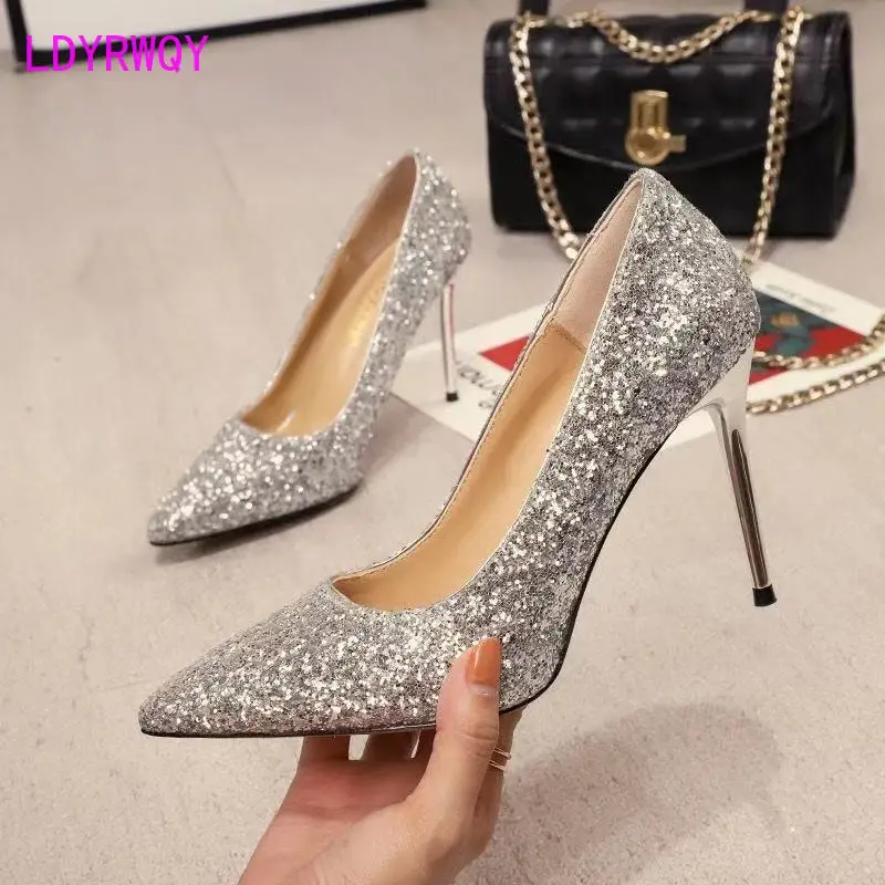 Новинка 2021, подходящие ко всему женские туфли на высоком каблуке с блестками и острым носком для французской девушки