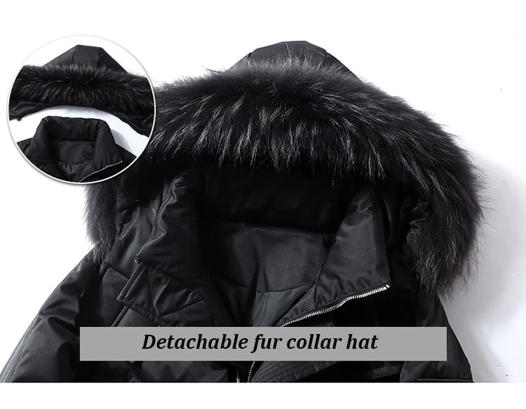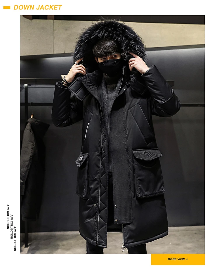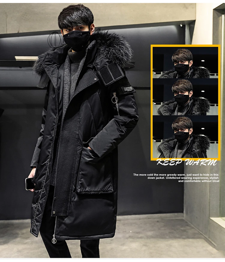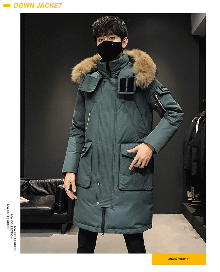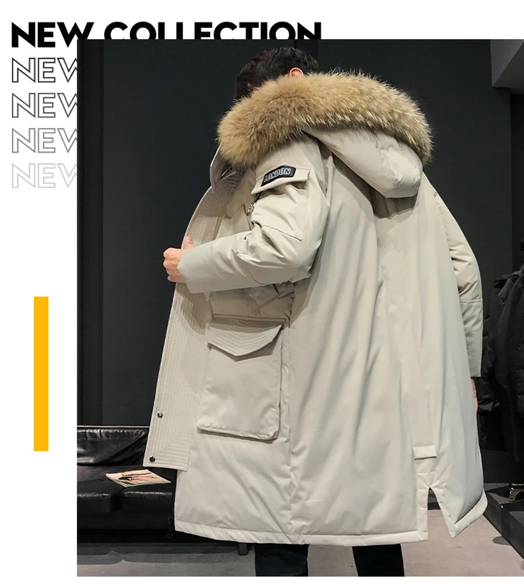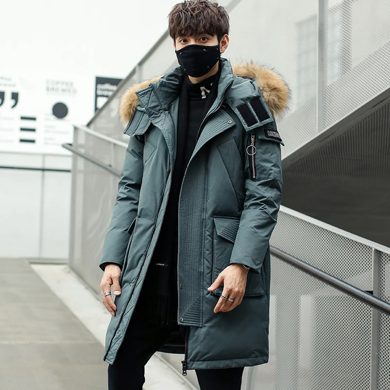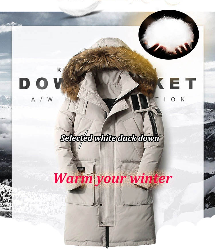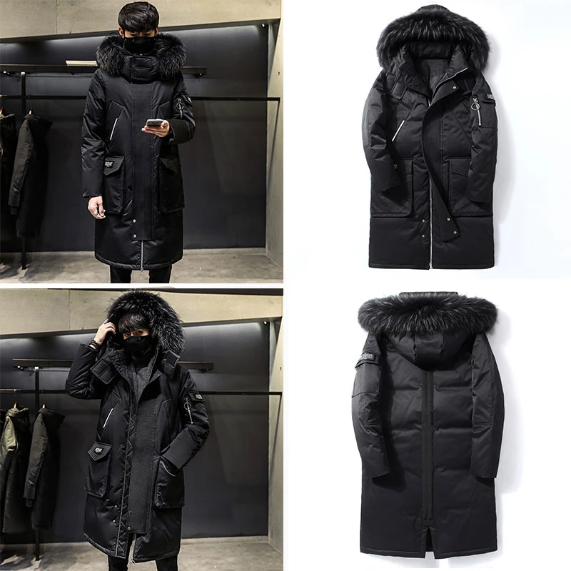 Мужской зимний пуховик, толстая теплая куртка с отстегивающимся капюшоном и меховым воротником, пуховик, парки, Мужская удлиненная куртка на белом утином пуху