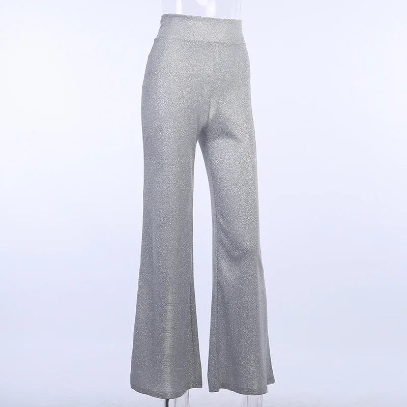 2021 серебряные блестящие широкие брюки с высокой талией и блесткам...