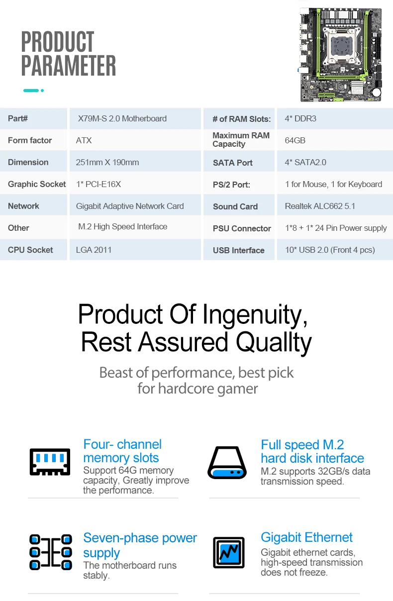100% новый и высокое качество!Чип: Q67/Q65/Z68 или другоеЦП: серия LGA 2011 E5-V1/V2Форм-фактор: M-ATX, 220 мм x 190 ммПамять: 4 * DDR3 слотМаксимальная емкость оперативной памяти: 64 ГБГрафика: 1 * PCI-E 4X1 * PCI-E 16XХранение: 4 * SATA2.0LAN: Встроенный 1 * Realtek RTL8111F чипсет, Gigabit EthernetАудио: Realtek Audio Codec ALC662, 5,1 поддерживает звуковой канал.Usb-порты: 10 * USB2.0 (задняя панель, разъем USB среднего размера)Решение блока питания: 1*8 Pin + 1*24 Pin источник питанияДругое: Бортовой NVMe M.2