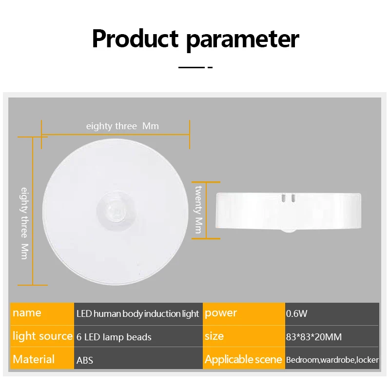 Особенности:1. Беспроводной дизайн, зарядка через USB2. Содержит магниты, легко устанавливаетсяСпецификация:Название продукта: светодиодный светильник с датчиком движенияИсточник питания: зарядка через USBСветильник источник света: 6 светодиодовМатериал: АБС-пластикМощность: 0,6 WРазмер: 83*83*20 ммЦвет: 6500K/белый светильникПосылка:Лампа-1 шт.1 х USB кабель1 х магниты
