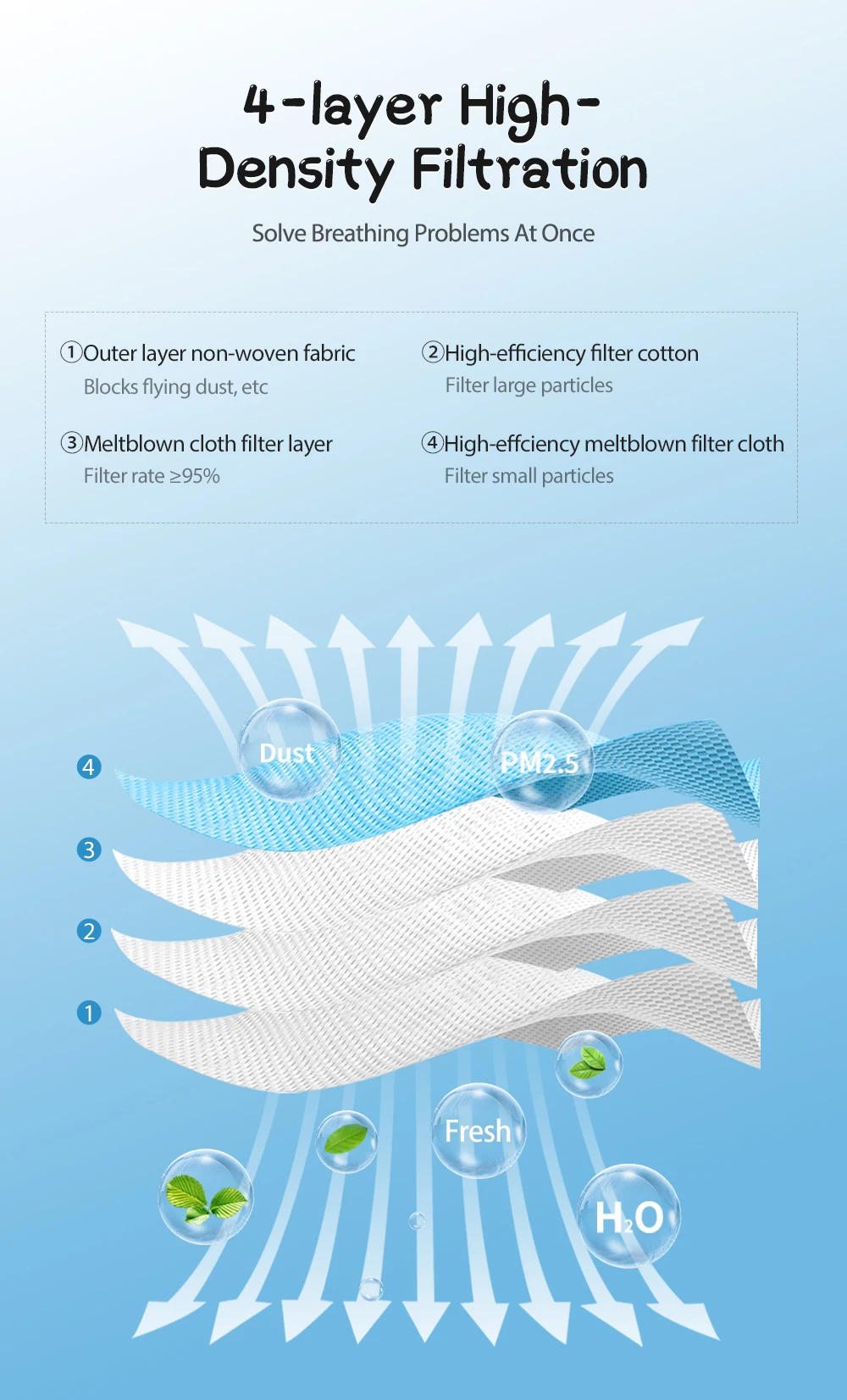 Стандарты фильтрации FFP2 и KN95 одинаковые. Материал, используемый в этой маске, соответствует классу FFP2. Этот продукт имеет 4 слоя нетканого фильтра. Аэродинамический Диаметр воздушного бактерий и грибковые поры в основном колеблется в пределах 0,7-10 мкм. Наша маска может фильтровать более 95% нежирных частиц ≥ 0,3мкм и имеет водонепроницаемое покрытие. Он может эффективно блокировать посторонние жидкости, капельки, кровь, пыль, ненормальные запахи и т. д.