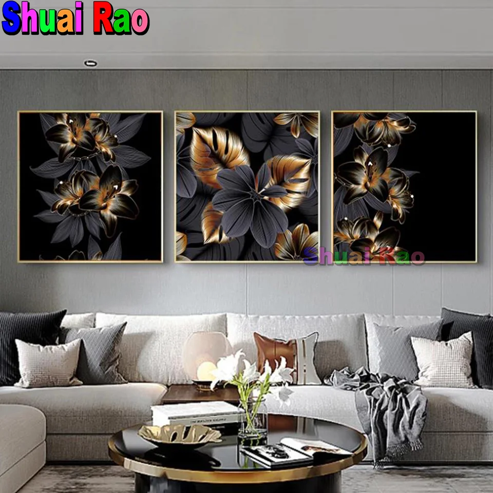 Триптих, черный, золотой лист, цветок, полный квадраткруглый, искусственный рисунок, вышивка крестиком, ручная работа, алмазная живопись