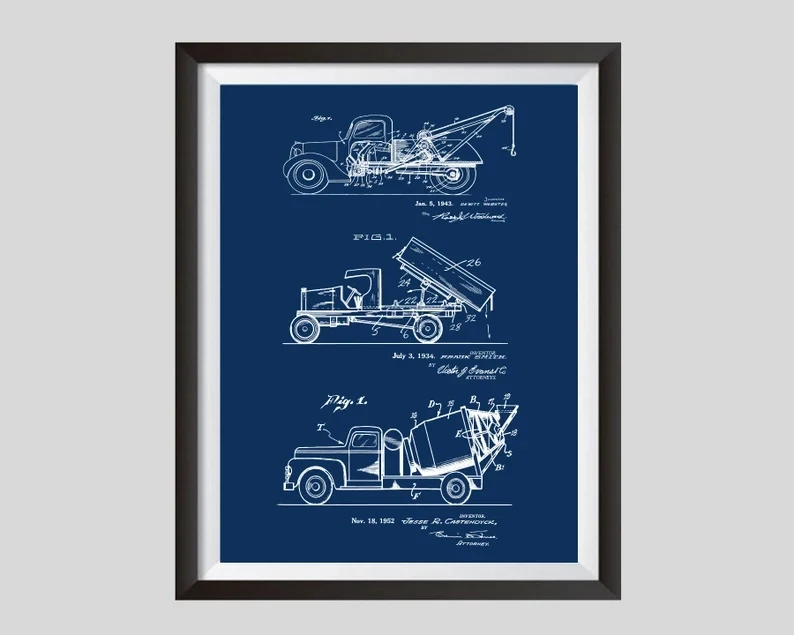 Самосвал, буксир, бетонный грузовик, плакат с запатентованной конструкцией, подарок грузовику, декор детской комнаты, настенное искусство
