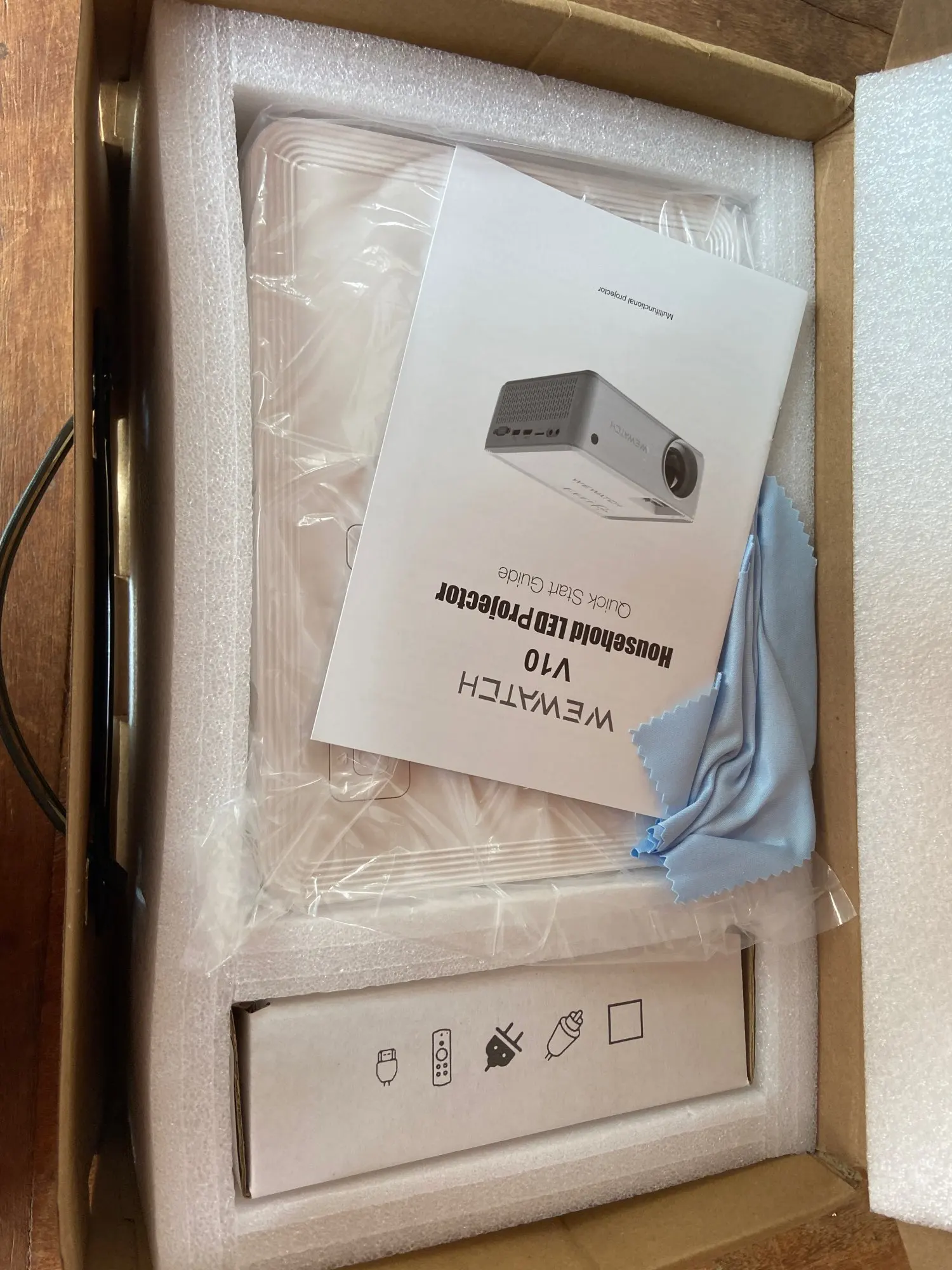 Мою посылку изнасиловали в службе доставки, но на комплектации это не отразилось. Прекрасный проектор. Легко подключился по блютузу к ноутбуку Передаёт четку картинку и хороший звук что идёт из встроенного динамика. Фотографию картинки не делаю так как камера не может чётко заснять. Доставка заняла две недели до Волгограда. В комплекте, пульт, HDMI кабель, и обычный ещё на три тюльпана.