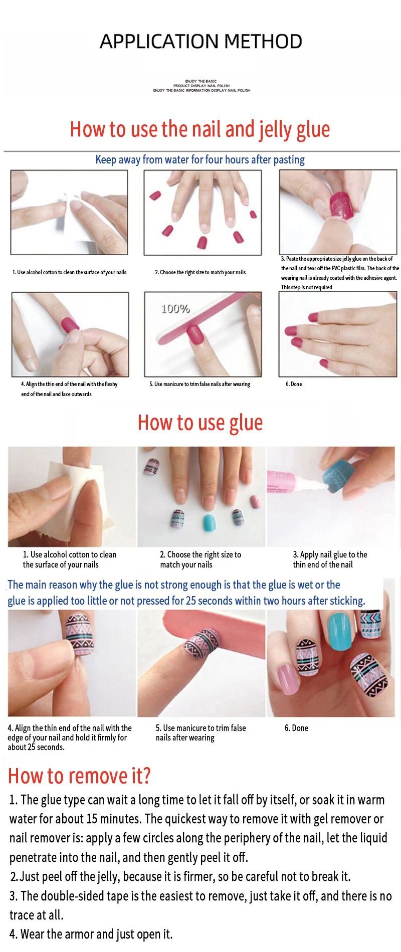 Напоминание: таблетки для лечения ногтей могут быть переработаны. Желейный клей можно разбирать повторно. Клей может быть разобран только с помощью клеевого агента, и клей может использоваться только один раз. Клей и Желейный клей не могут использоваться одновременно. Рекомендуется использовать желеобразный клей, если вы хотите разобрать в любое время, и использовать клей, если вы не хотите разбирать в любое время.