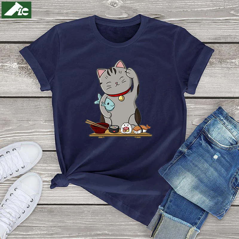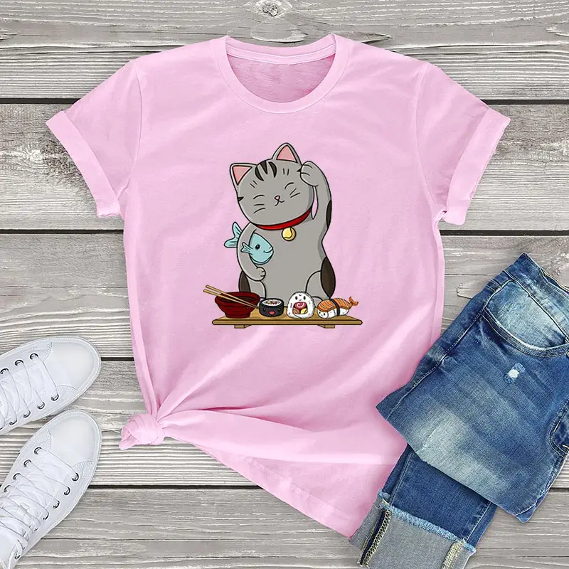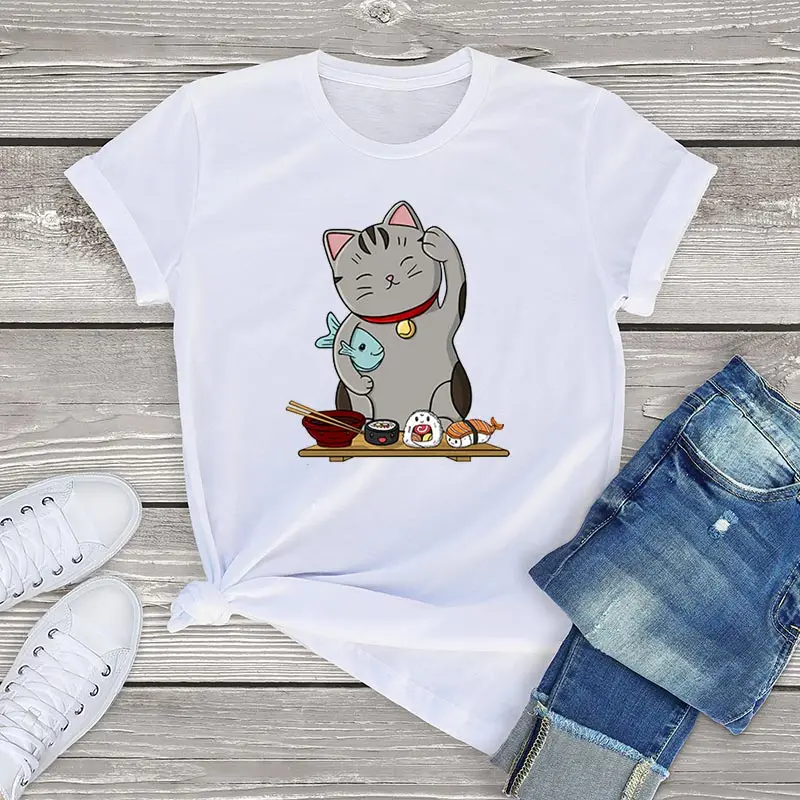 Унисекс, хлопковая футболка в японском стиле с забавным котом, женская одежда, японские суши, рыбы, графические женские рубашки, 90S, модный топ для девочек, европейский размер