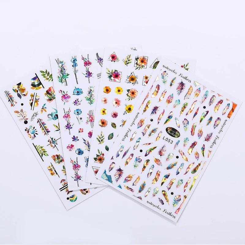 Переливающиеся перья, 3D наклейки для ногтей, голографические лазерные наклейки для ногтей, цветов, Листьев, весна-лето, слайдер для ногтей