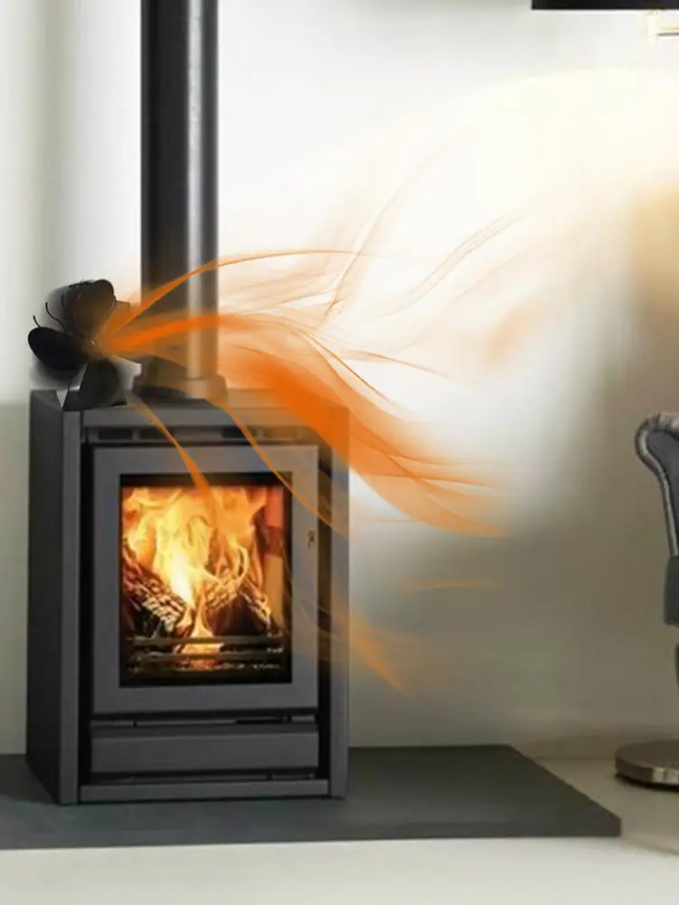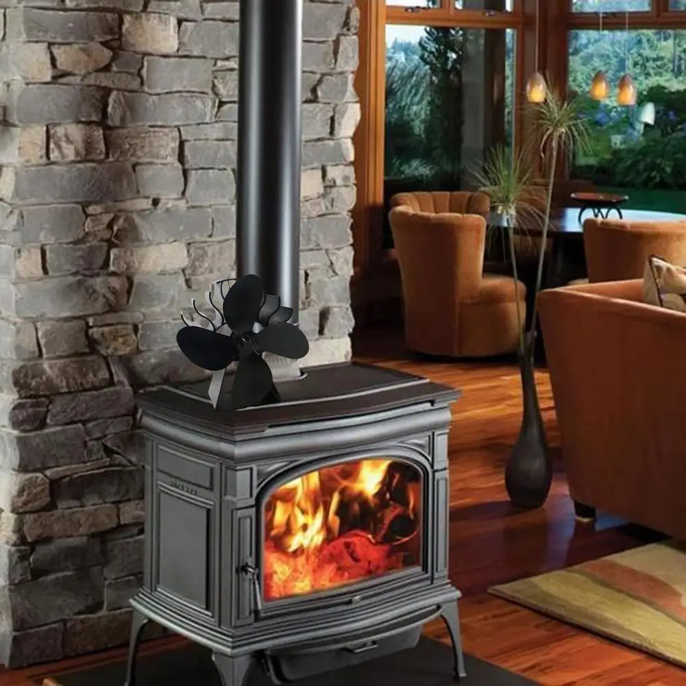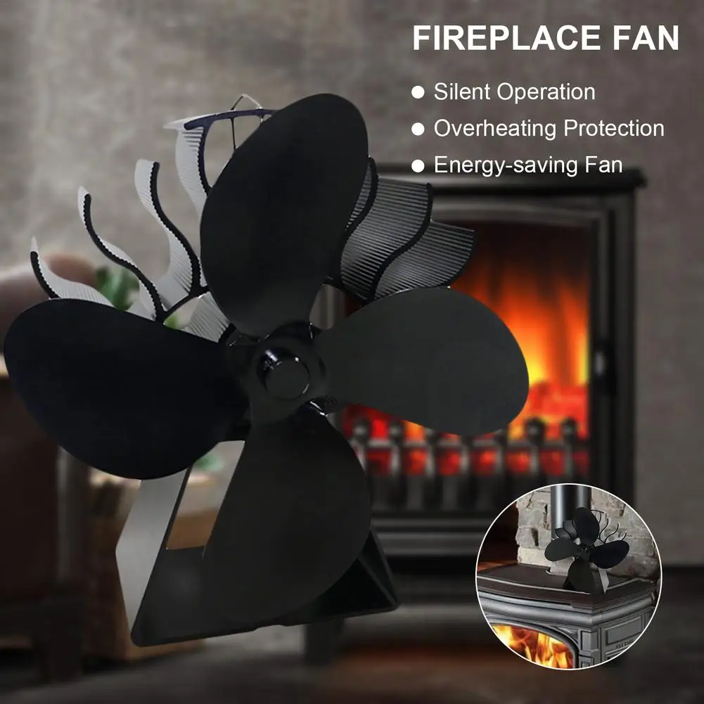 Черный камин, 4 лезвия, рабочая деревянная горелка Ecofan, тихая домашняя фотография, эффективное распределение тепла # W0