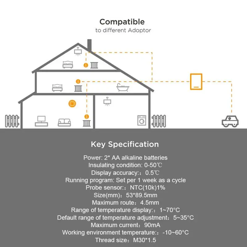Он подключается к другим устройствам Zigbee через беспроводной шлюз и имеет широкий спектр приложений. Он подходит для жилых, торговых, гостиничных отопления и центрального контроля температуры кондиционирования воздуха. Он оснащен совместимыми разъемами. Это умный помощник по контролю температуры. Он имеет режим отпуска и отдыха. Ежедневную температуру можно установить индивидуально; Время работы устройства можно установить в приложении smart life, с мини-дизайном, простой работой, удобным дисплеем и экономией пространства; еженедельные настройки программирования могут быть настроены на 5 + 2, 6 + 1, 7 дней и шесть периодов.