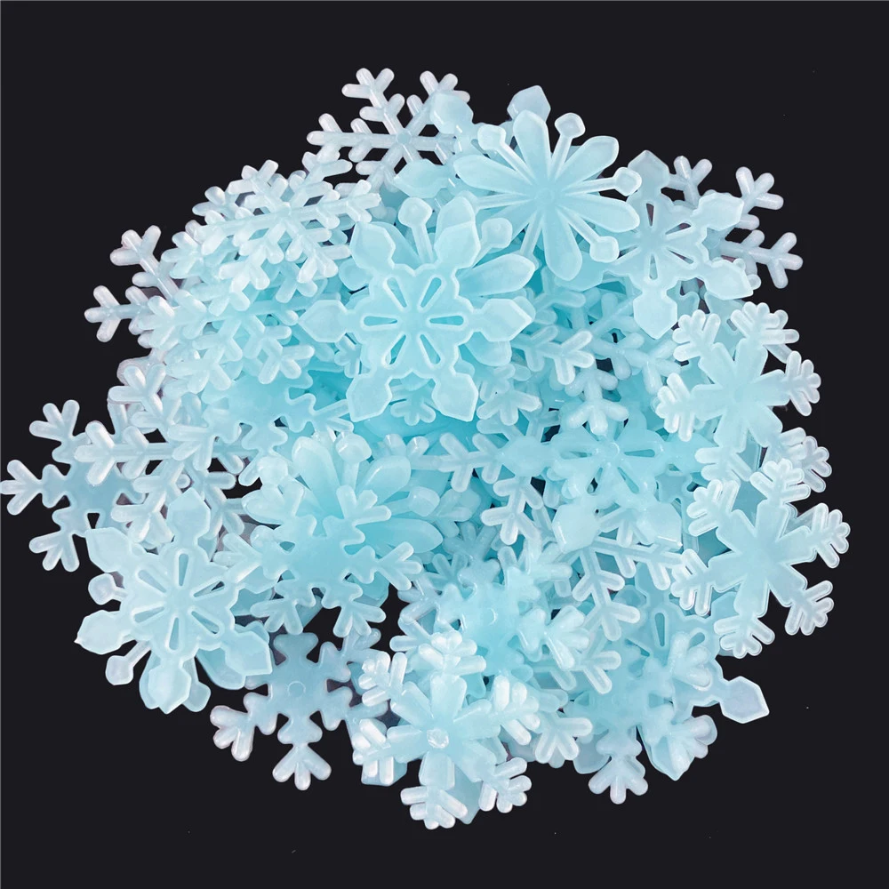Светятся плохо, можно сказать не светятся вообще . Да и не наклейки это , а пластмассовые снежинки , которые клеятся на двухсторонний скотч, который идёт в комплекте.