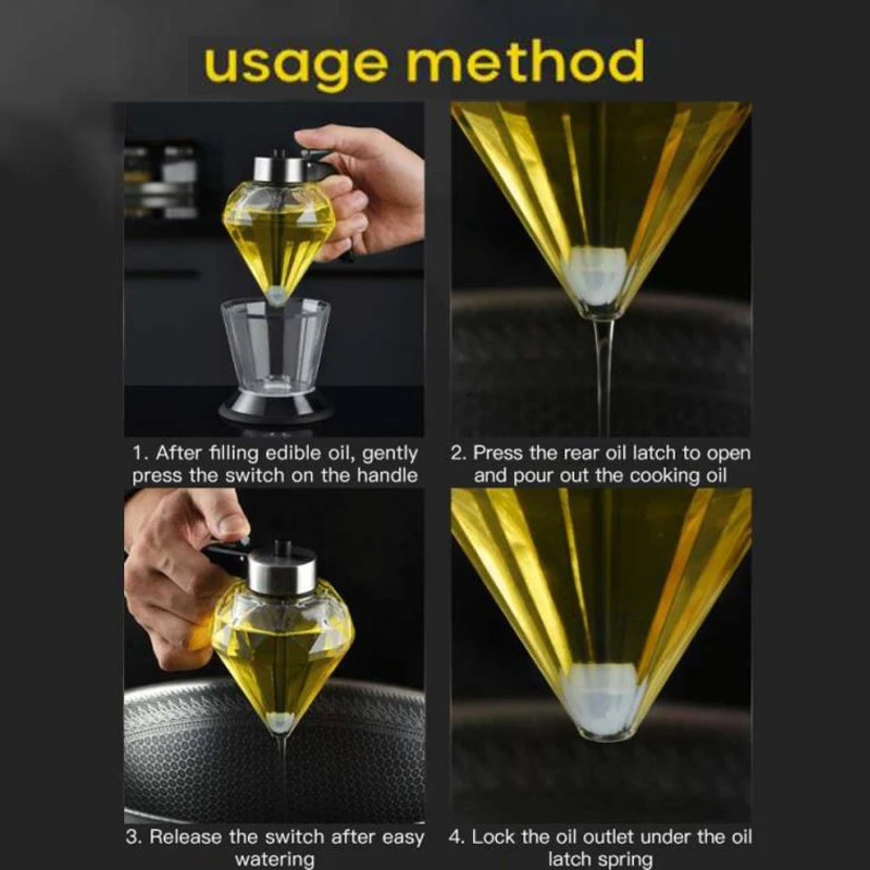 Материал и структура: Он изготовлен из пищевого бессвинцового стекла, который в наибольшей степени защищает здоровье вас и вашей семьи. Он состоит из стеклянного диспенсера в форме бриллианта и основания. Масло не будет капать или течь из сопла, сохраняя бутылку и столешницу чистой.