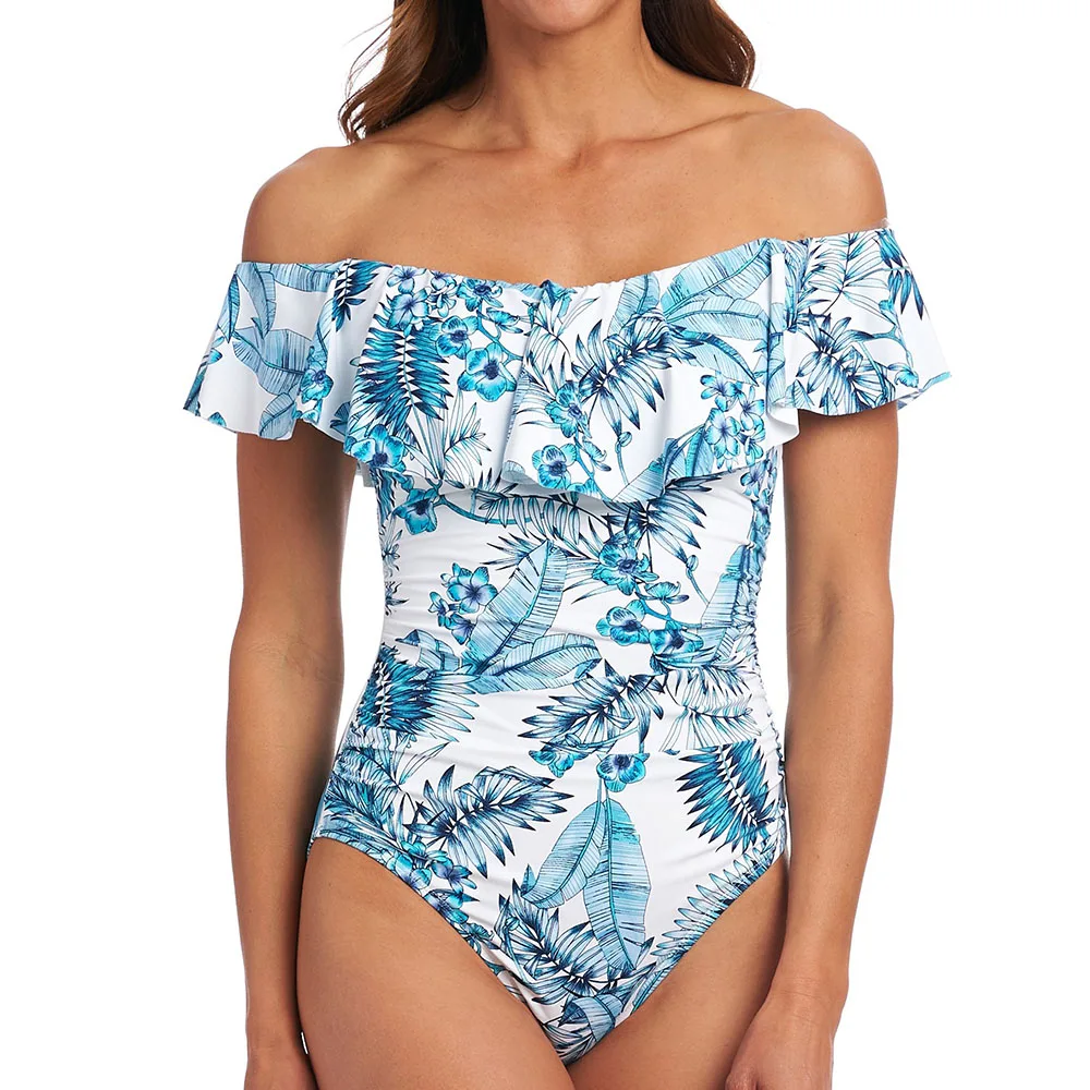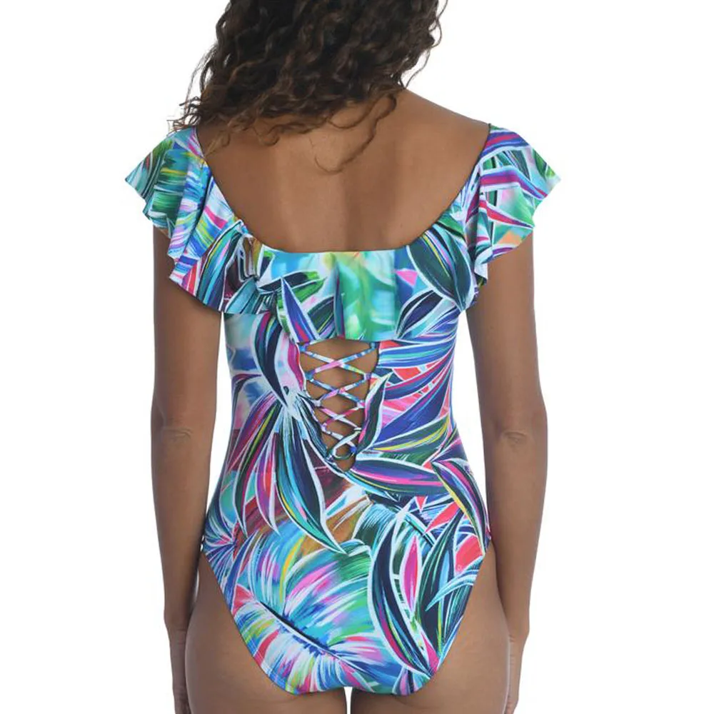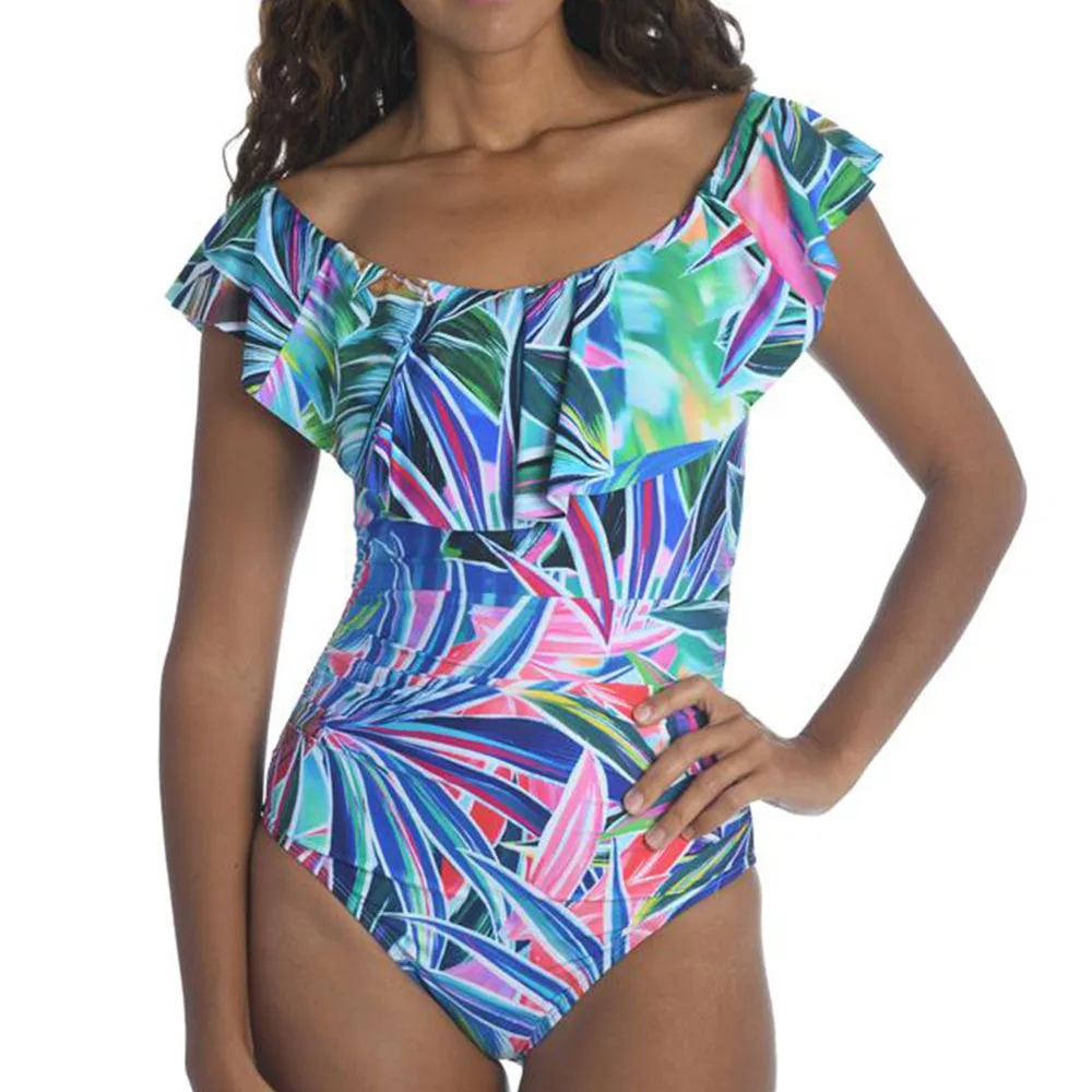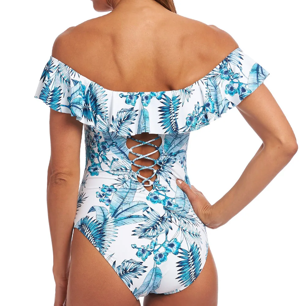 Женский слитный купальник с принтом листьев, оборками и открытой спиной
