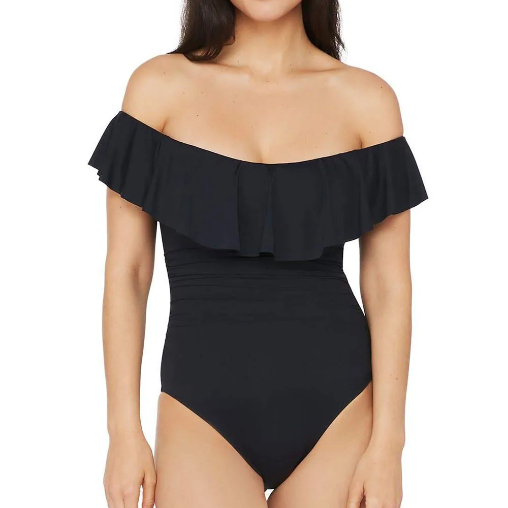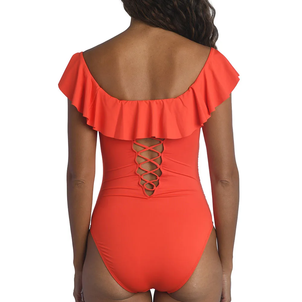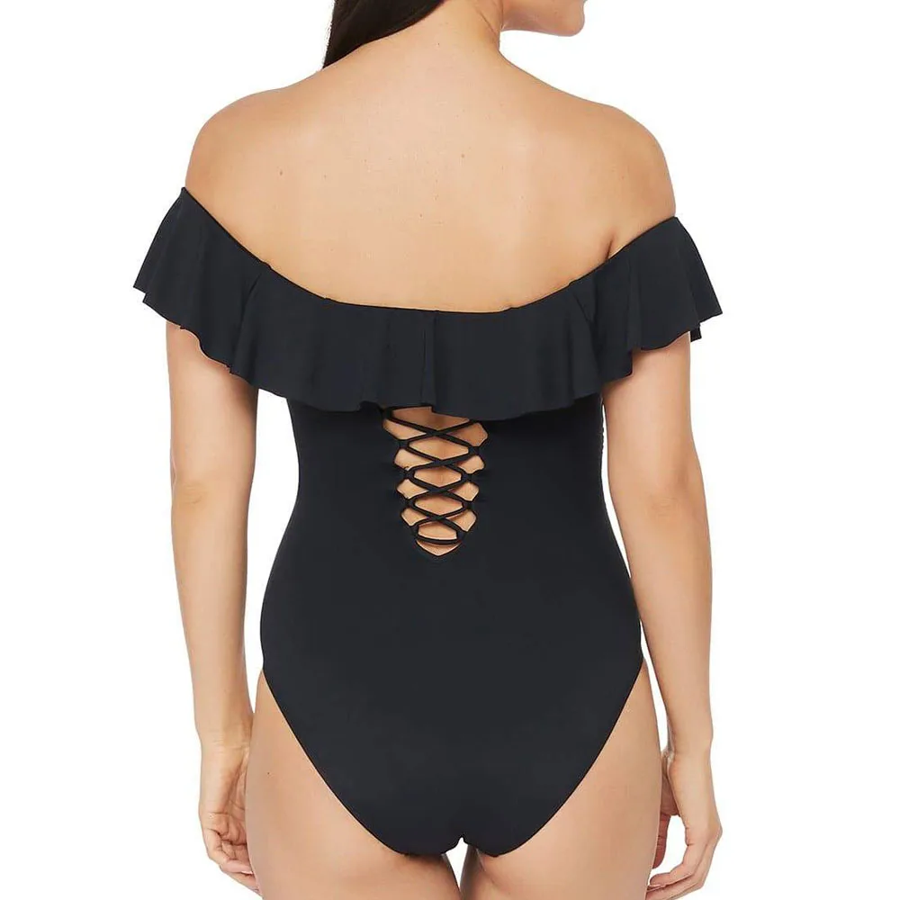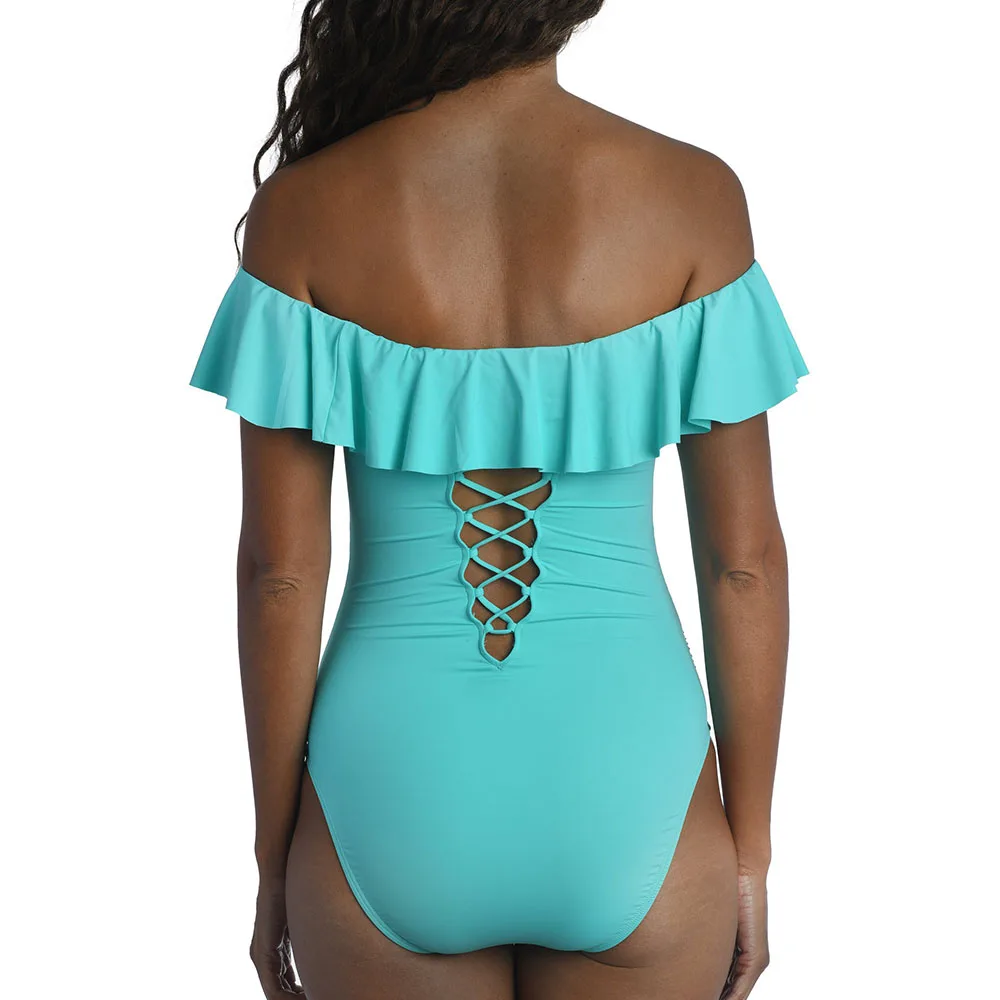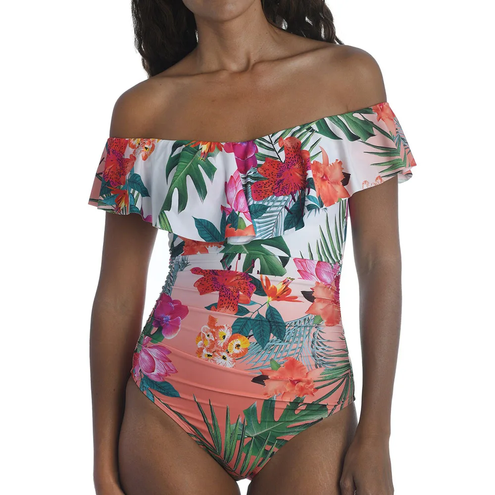 Женский слитный купальник с принтом листьев, оборками и открытой спиной