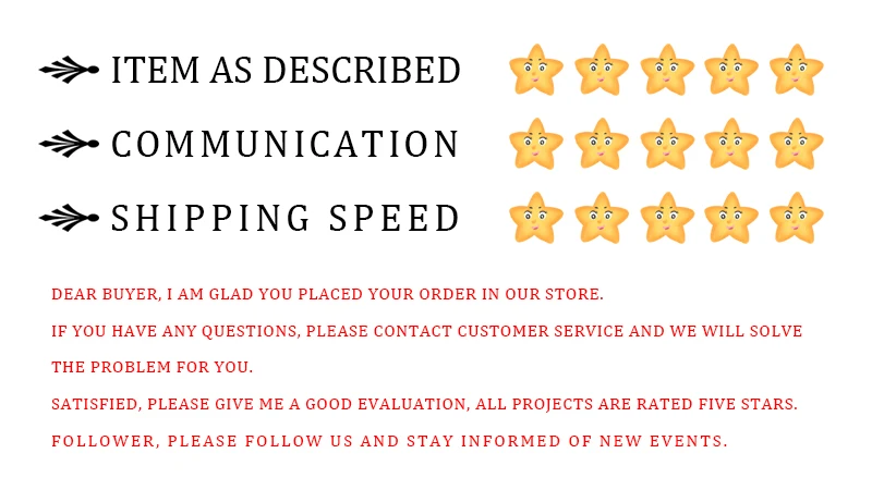 Estimestimado comprador yo contento que haya realizado un pedido en nuestra tienda! Si tienes alguna pregunta ponte en contacto con el Servicio de Atención al Cliente y Te ayudaremos con tu problema?¡¿Si estás satisfecho con nuestros товары. Por favor ¿Déjanos una buena evaluación y pon cinco estrellas en la evaliación?