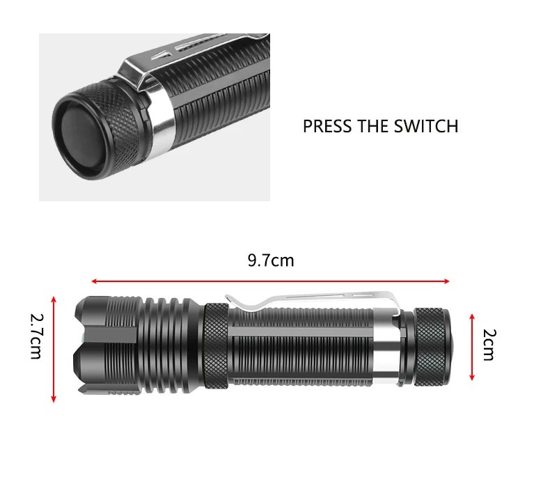 6. Срок службы лампы: 100000 часов 7. Цвет Фонарика: черный 8. Излучаемый Цвет: белый светильник 9. Переключатель: Кнопочный переключатель 10. Чехол Материал: Прочный авиационный алюминий 11. Расстояние освещения: более 200 метров 12: светодиодный срок службы: более 100000 часов