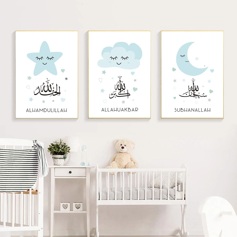 Настенный художественный холст, звезды, луна, исламский постер, картина для гостиной, Allahu Akbar, принты для детской спальни, домашний декор, каллиграфия