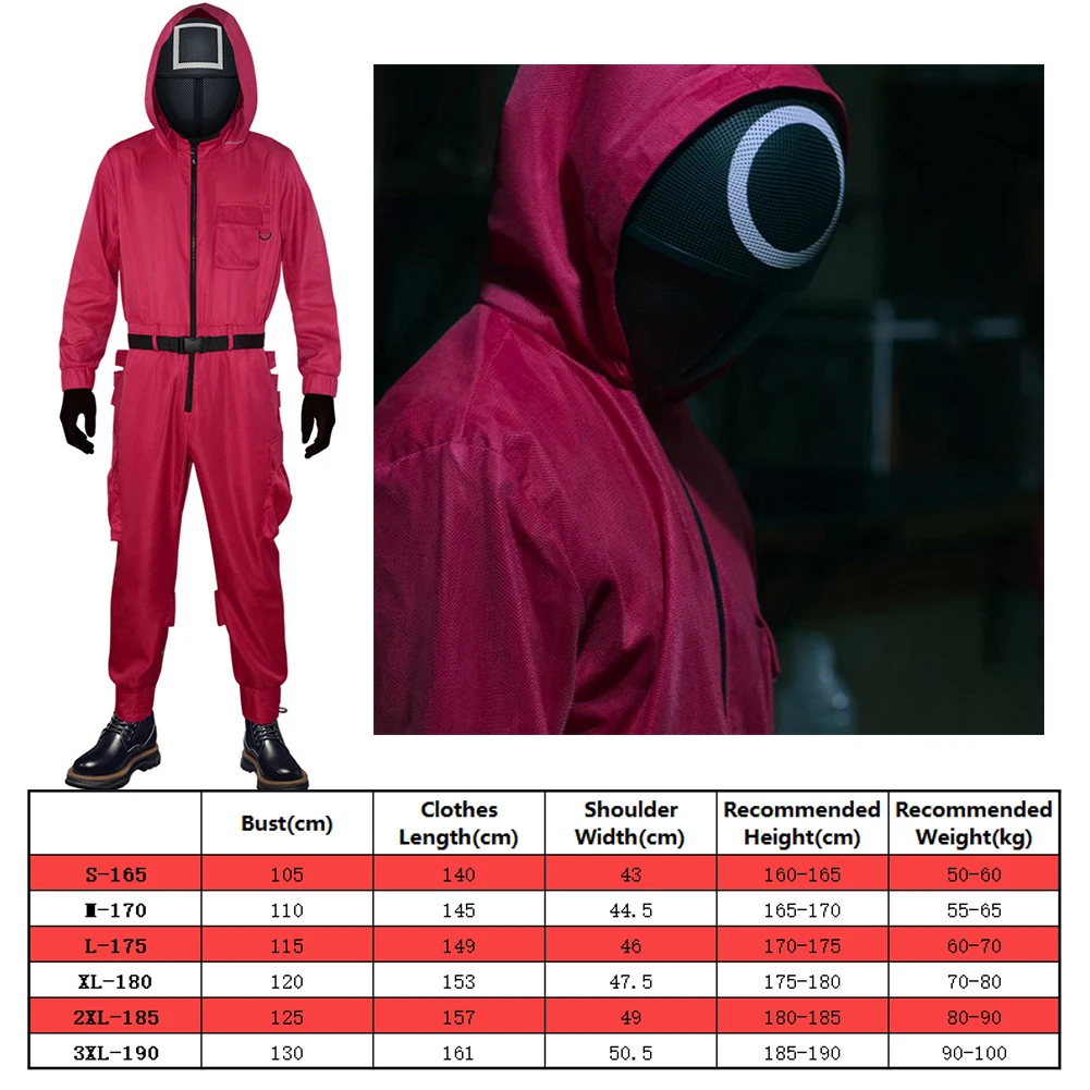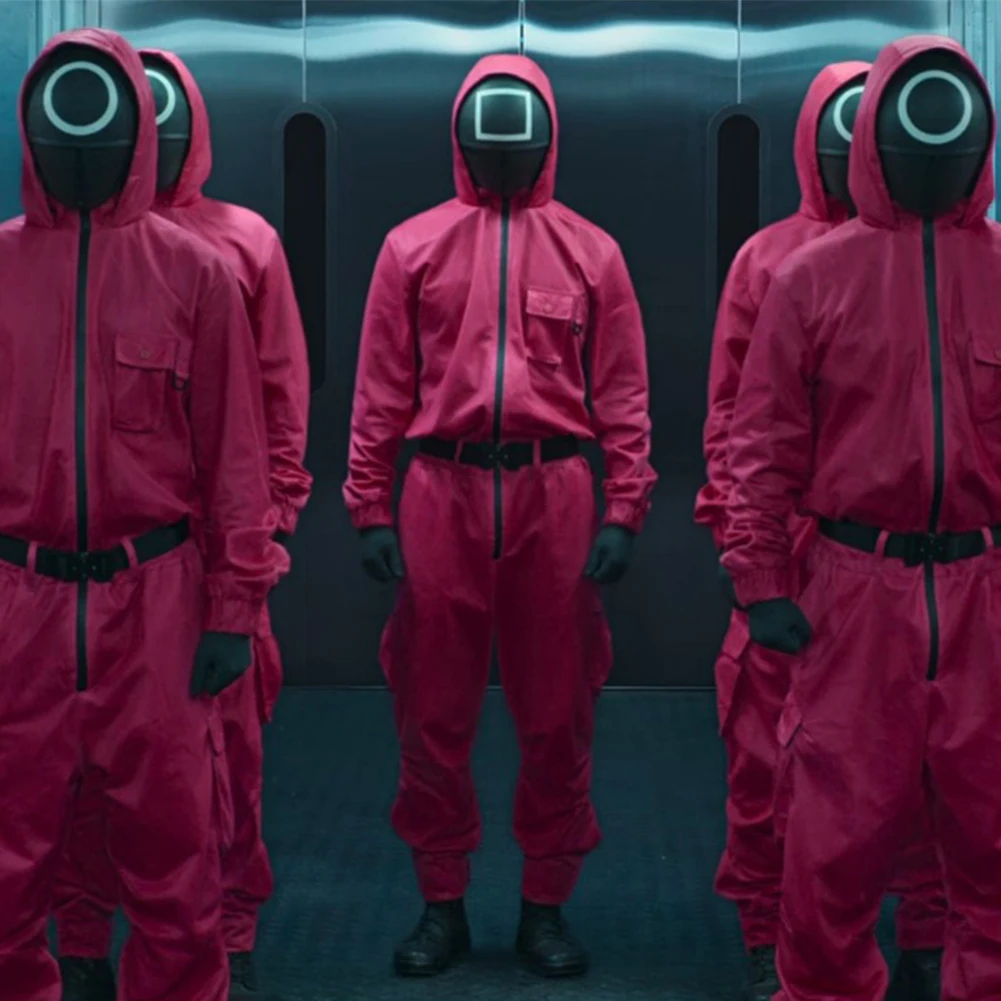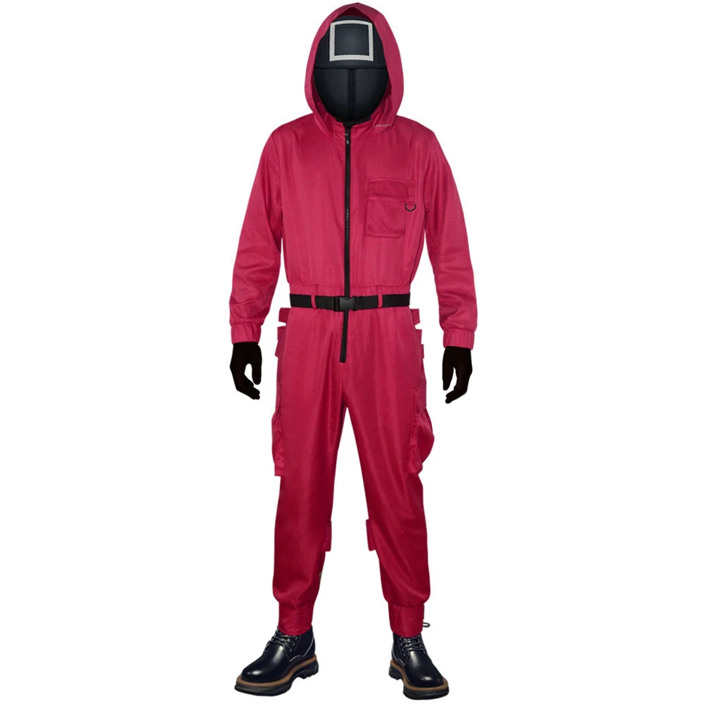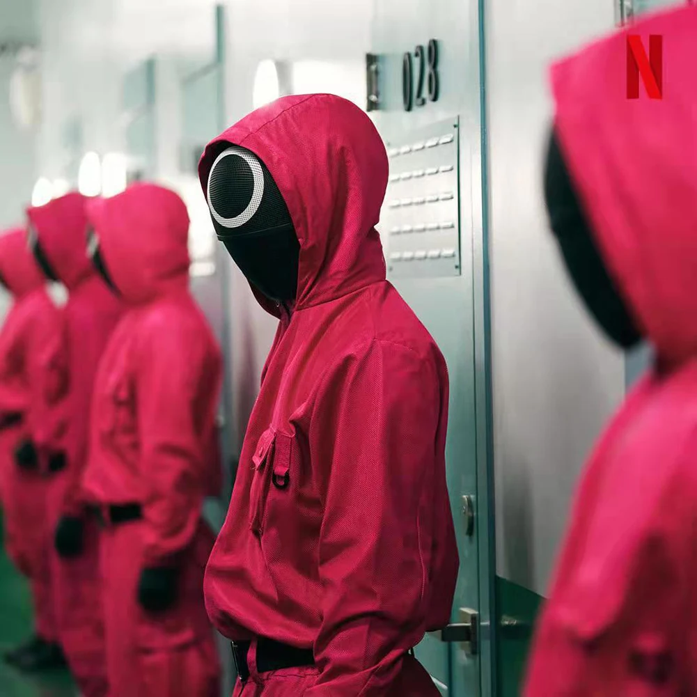 Персонажи: Красная маска-комбинезон для игры в кальмары.