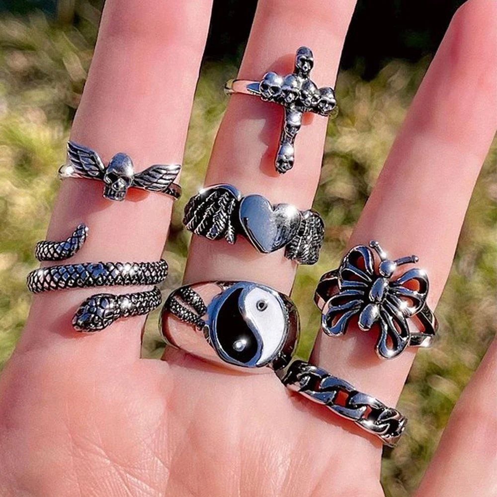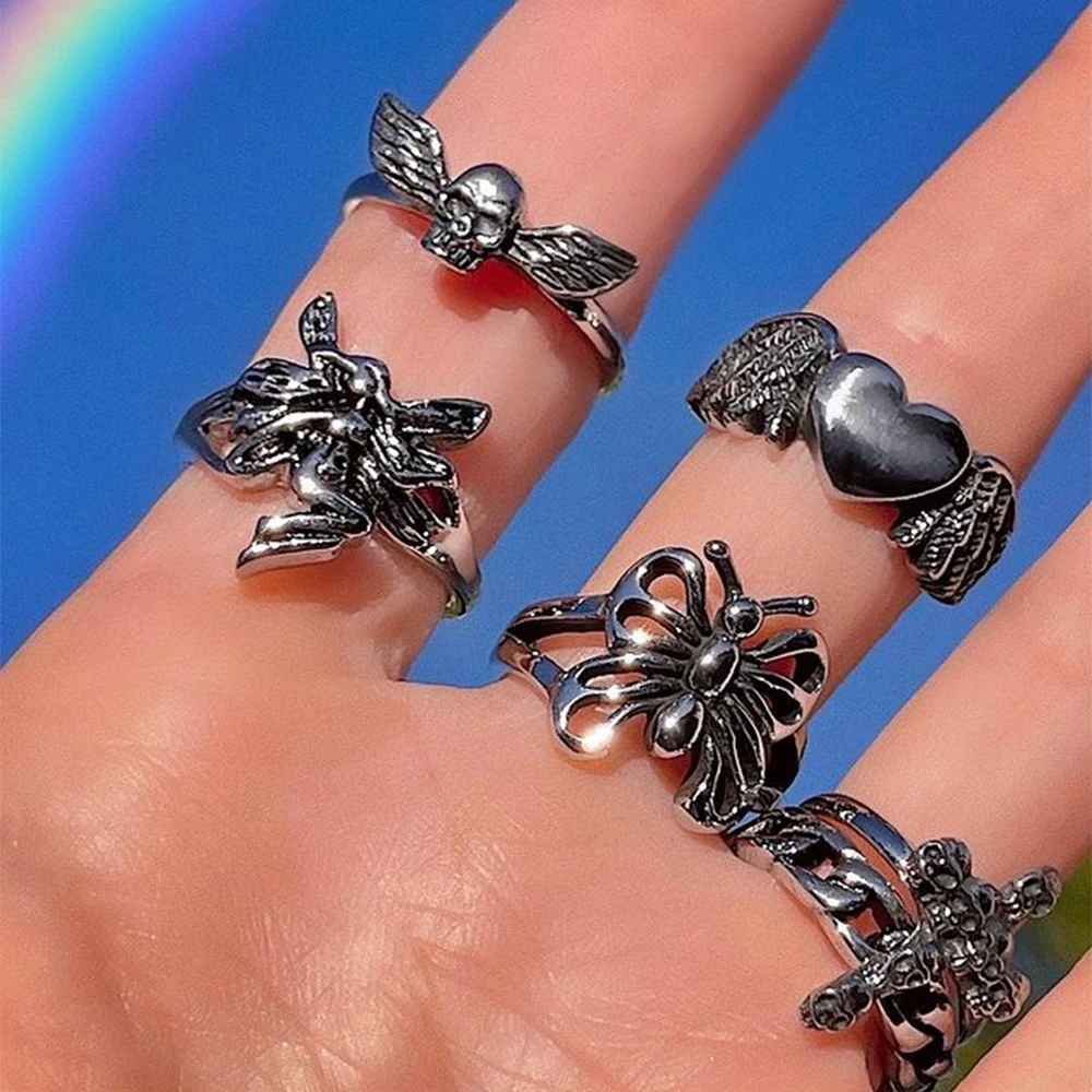 Панк готический Ангел волшебные кольца набор для женщин мужчин Ретро серебряное покрытие бабочка сердце очаровательное кольцо ювелирные изделия