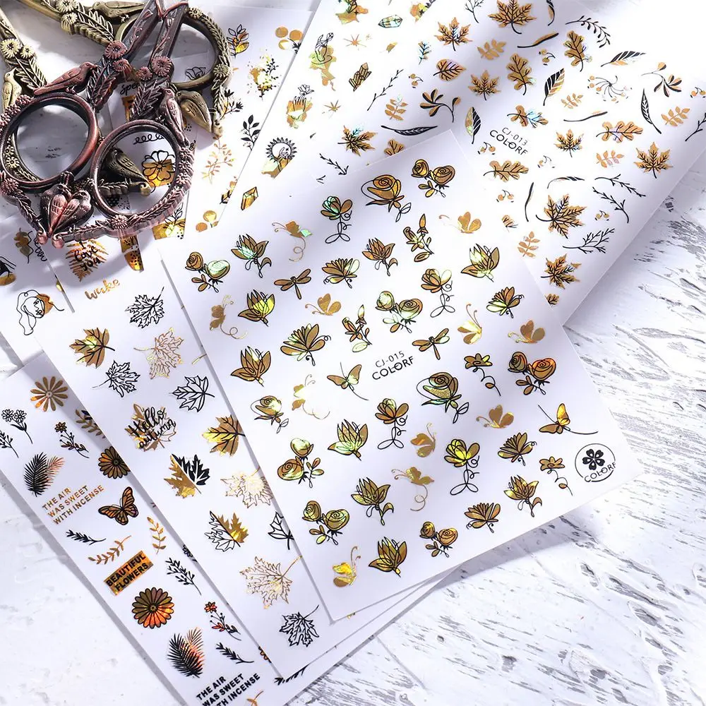Золотая наклейка для дизайна ногтей, наклейки с листьями, стикер, 3...