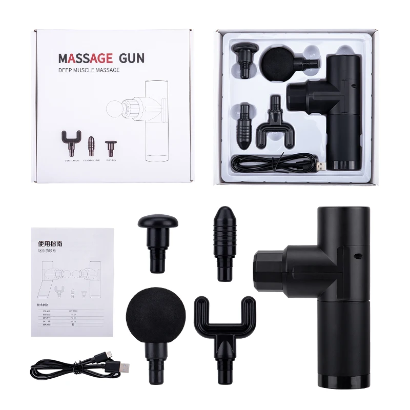 Посылка включает в себя:1 * массажный пистолет4 * Массажная головка1 * линия зарядки typeC1 * упаковочная коробка