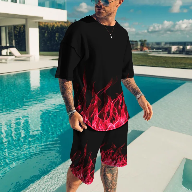 Мужской повседневный костюм, футболка с коротким рукавом и шорты с принтом в виде огня, однотонная мужская спортивная одежда для мужа, Новинка лета 2021