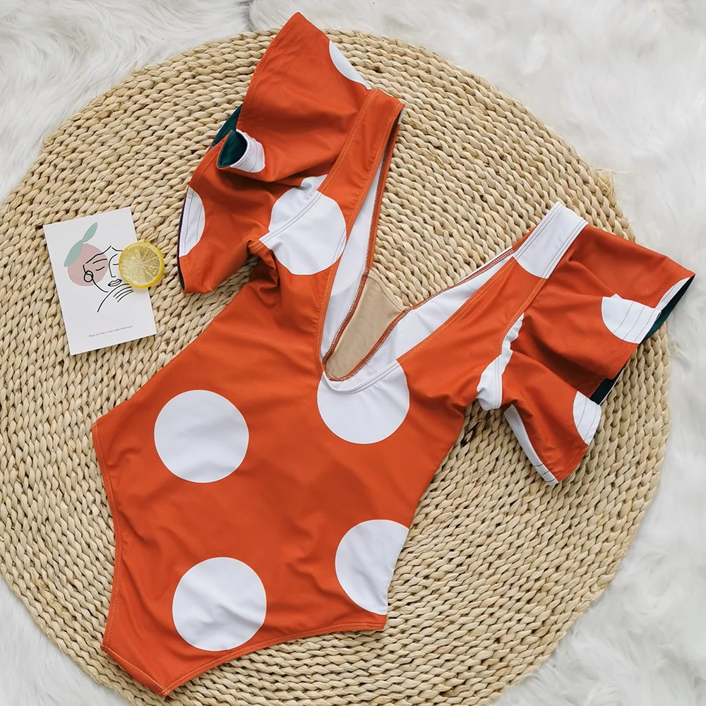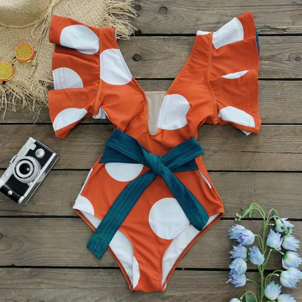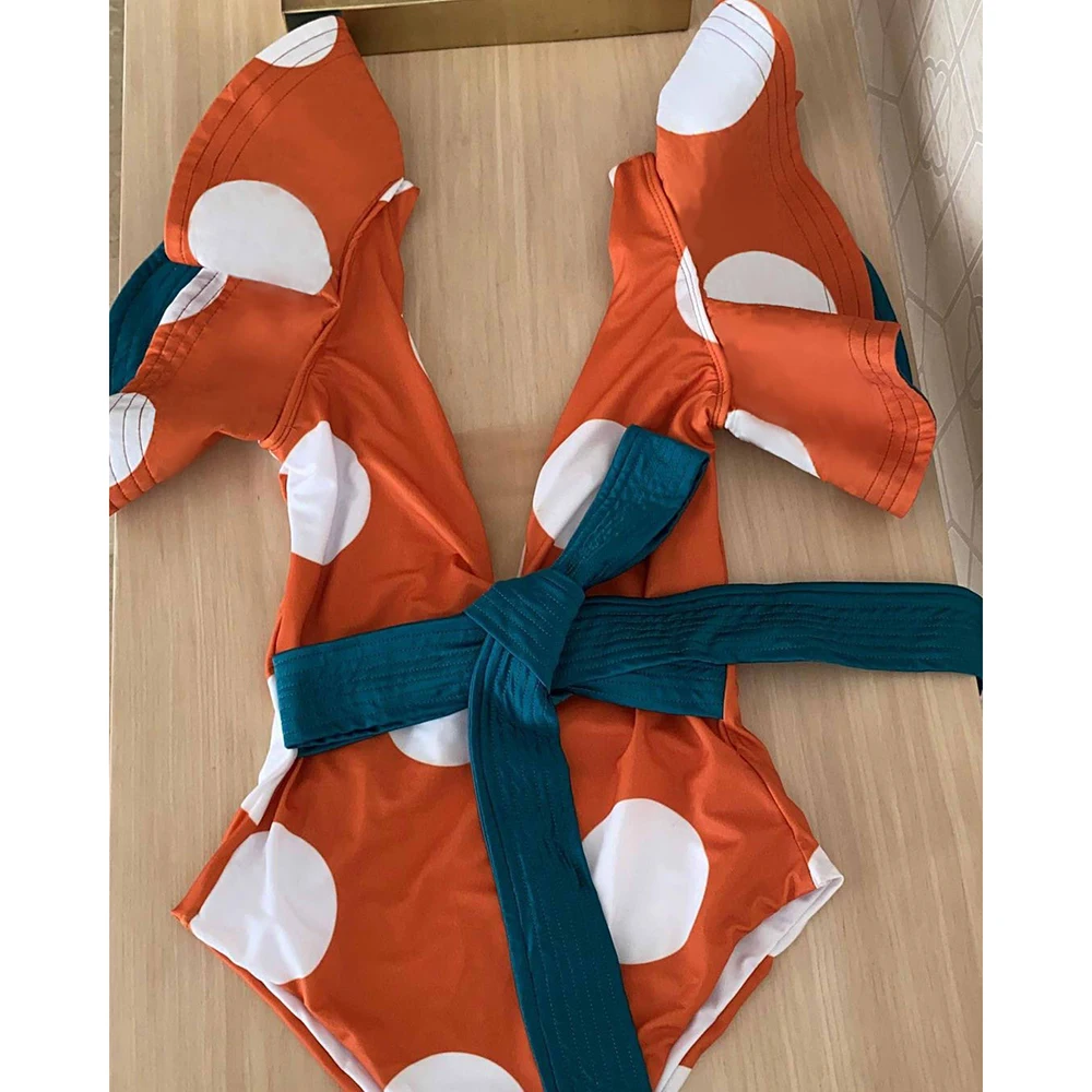 Женский слитный купальник в горошек, с поясом и большими рукавами-воланами, сетчатый боди, сексуальный купальный костюм с вырезами, женский купальный костюм с высоким вырезом