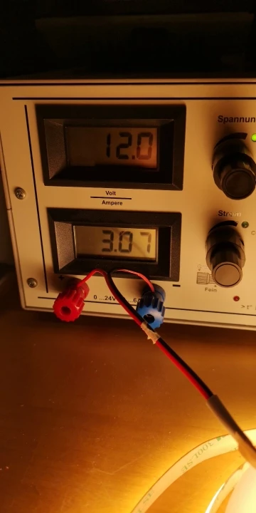 Описание путает: в нем указано 12-15 Вт. Я заказал 5 метров. Ярлык на упаковке: 15 Вт/м (на метр!). Измерение при 12 В постоянного тока считывает 3 ампера для всей полосы (5 м = 36 Вт), что составляет около 7,2 Вт на метр. В любом случае полоса яркая и тем не менее очень теплая. Больше похоже на 2500K, чем на 2700K.