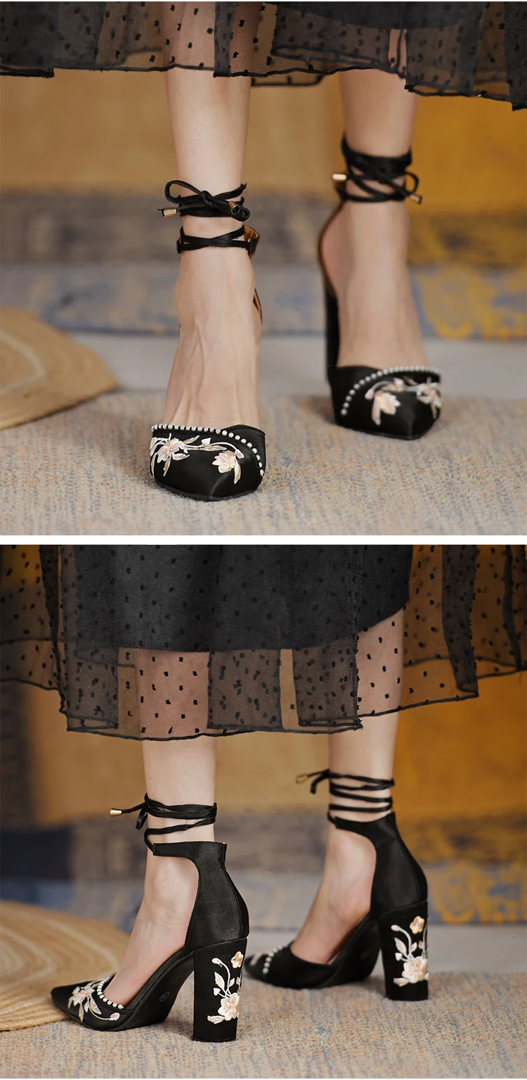 Женские босоножки на шнуровке, черно-белые босоножки на очень высоком каблуке 9,5 см, с вышивкой, в китайском стиле
