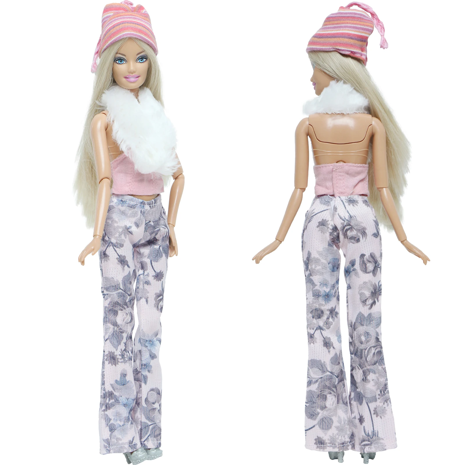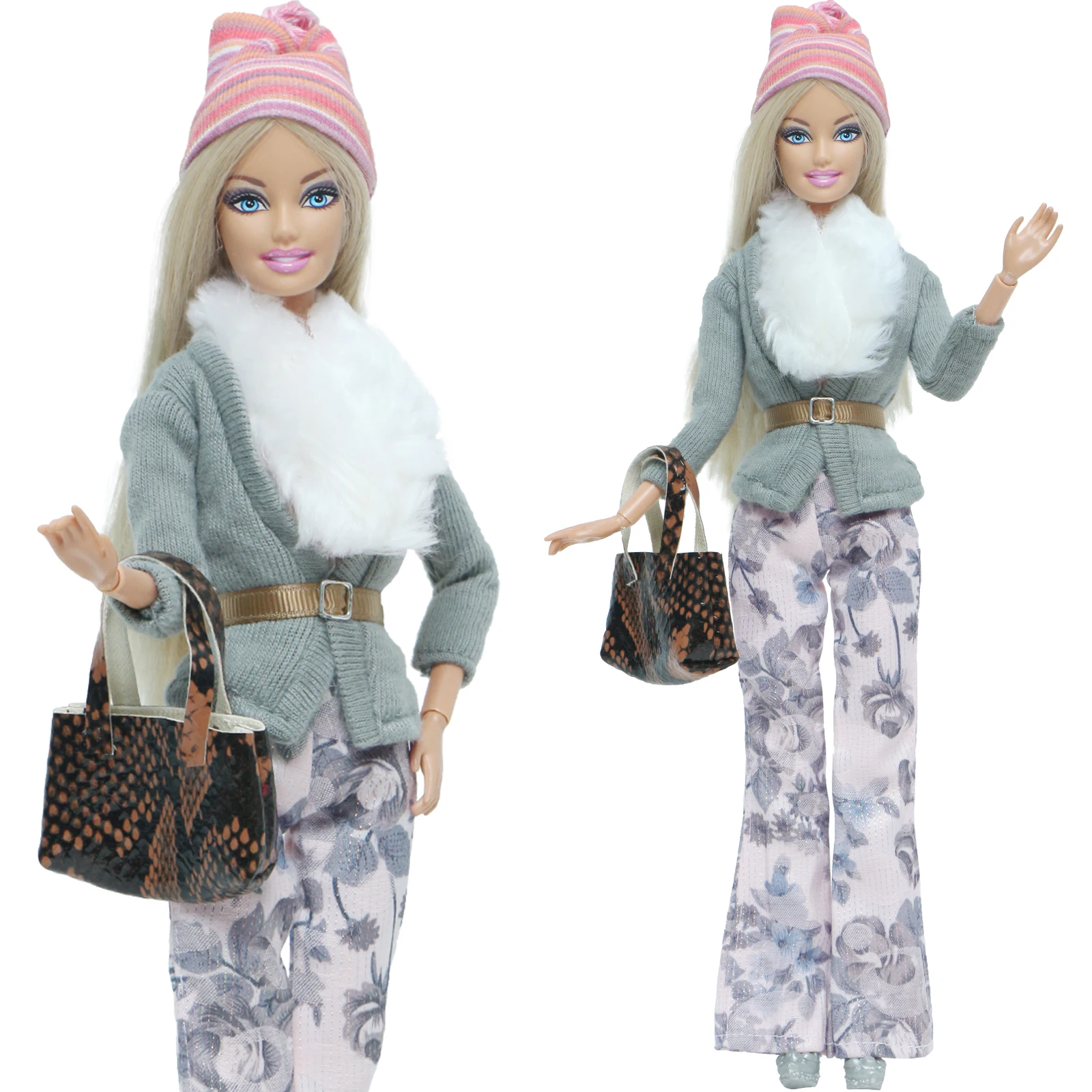 Зимний наряд BJDBUS, пальто, меховой жилет, штаны с принтом, на высоком каблуке, женская сумка, ремень, одежда, аксессуары для куклы Барби, Подарочная игрушка