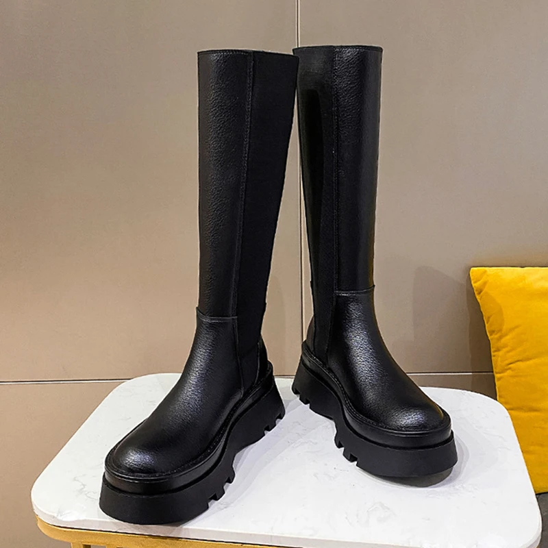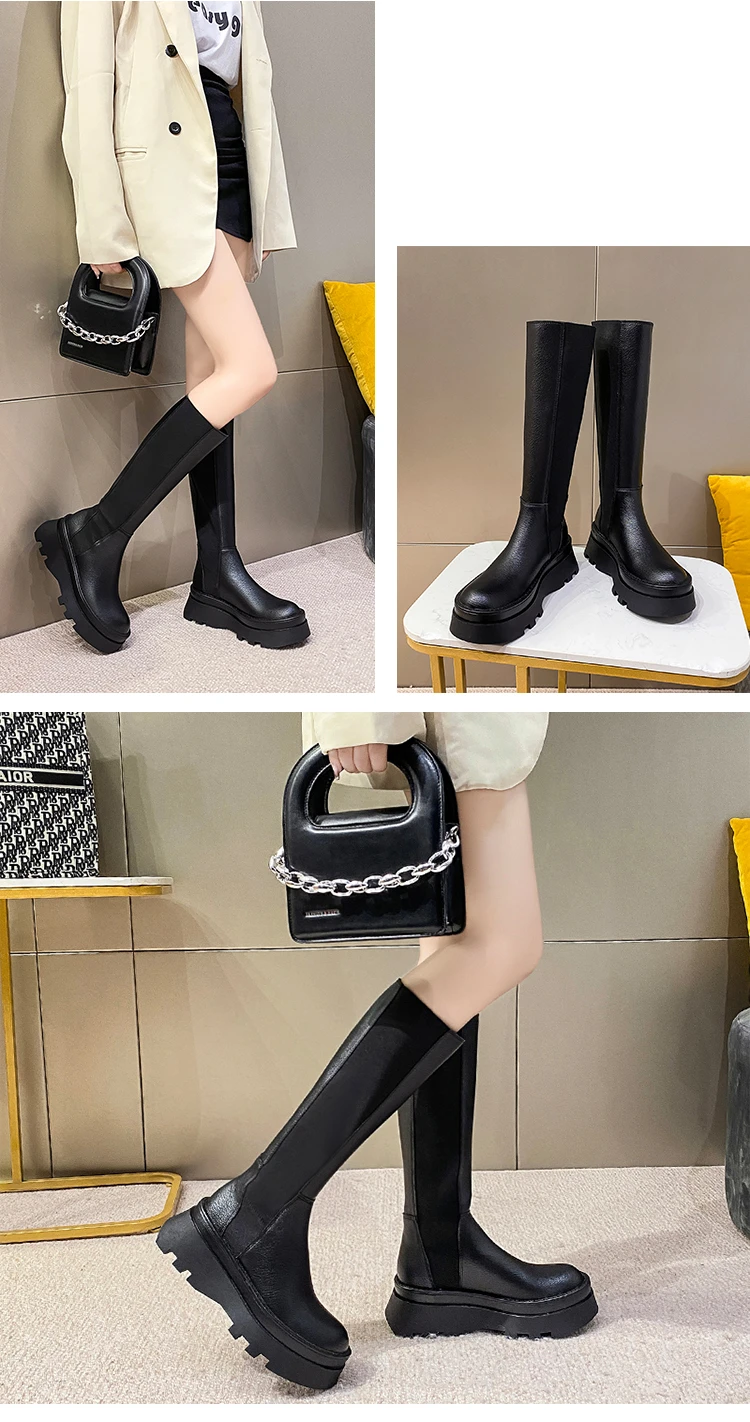 Женские высокие сапоги, сезон весна-осень 2021, модные женские сапоги до середины икры на платформе из искусственной кожи, без застежки, готические длинные сапоги до колена, Черная женская обувь