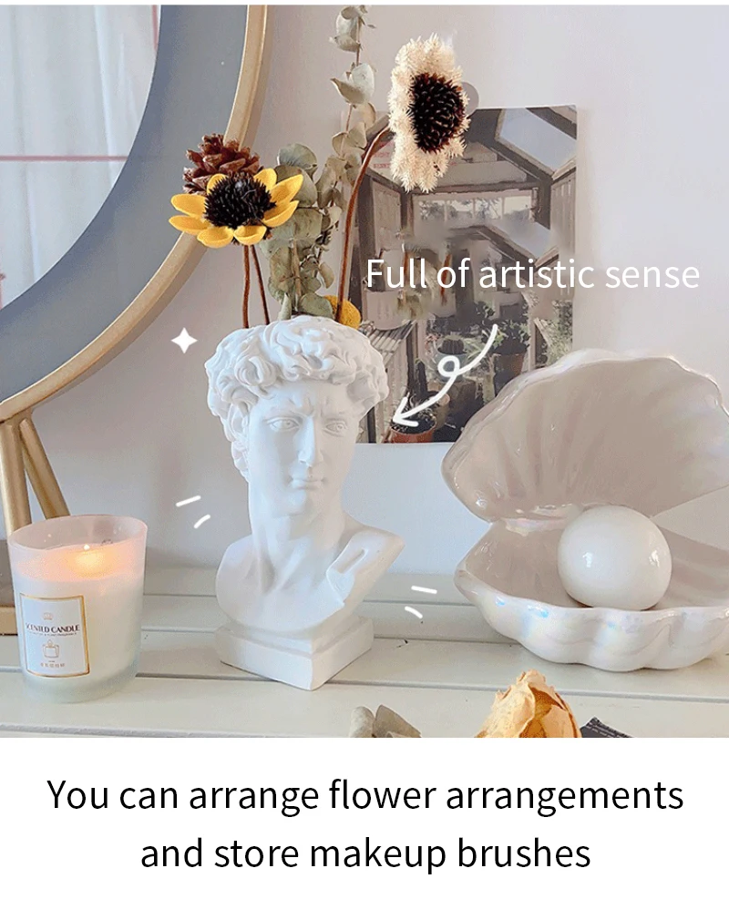 2. Многократное использование: Эта уникальная статуя Давида бюста, подставка для кистей для макияжа, может держать ваши кисти для макияжа, подводку для глаз, тушь для ресниц и аксессуары. Его также можно использовать как вазу, держатель ручки, суккулентный плантатор, комнатный/открытый плантатор, и украсить ваш обеденный стол, ванную комнату, столешницу и офис.