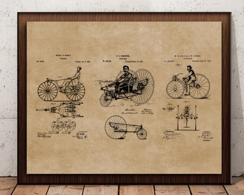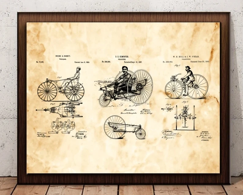 Винтажное Велосипедное искусство, 1880-е Velocipede группа патентов, велосипедное искусство, плакат с велосипедом, ранний трехколесный велосипед, рисование