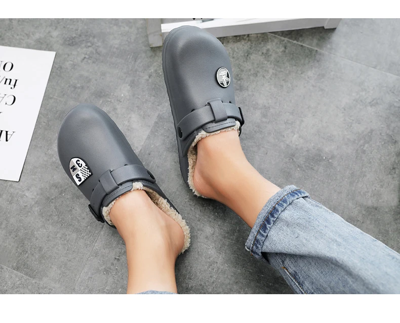 Qmaigie/зимние мужские тапочки; Водонепроницаемые Сабо; Теплая пушистая хлопковая домашняя обувь; Шлепанцы с квадратной пряжкой; Домашние тапочки