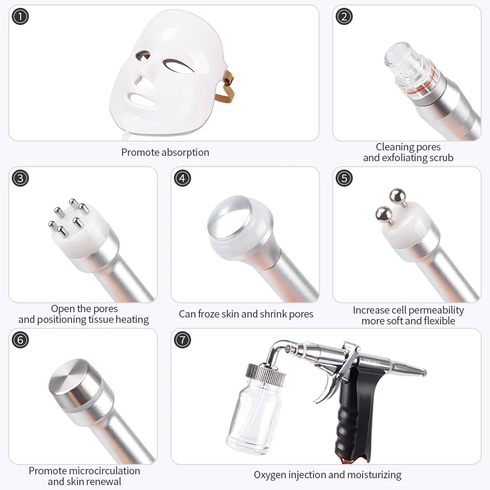 Спецификация:1) дермабразия воды: 1 ручка и 4 наконечника2)Ultransound :1 ручка и 1 МГц3) био-микроток: 1 ручка4) многополярный RF : 1 ручка и 1 МГцНапряжение 110V60HZ 220V5 0HZ мощность 250 ± 5 ВтСистема рециркуляции воды даСистема оповещения о воде да1. Ручка для очистки пузырьков:В богатой кислотной среде углекислого газа снижают значение PH в клетке, внутриклеточное кровообращение с гемоглобином и снижают способность, известную как: Bohr эффект, может улучшить кровообращение, увеличить содержание кислорода в крови, ускоряет метаболизм клеток кожи.2. БИО ручка:Подтяните мышцы глаз, усиливайте гибкость мышц глаз, чтобы текст окончания потери глаз, сумки для глаз, очки снимали усталость, уменьшали темные круги3. RF ручка:Продвижение фибробластов производит Восстановленный коллаген, делая кожу более упругой, гладкой и без морщин текстуру кожи.4. Ультразвуковая Ручка:Использование высокочастотного ультразвука на коже 1 Гц внутренние стимуляторы вибрации, в результате чего тепид приводит к улучшению метаболизма клеток кожи и способствует циркуляции крови, В то время как нижняя часть продукта входит в кожу, улучшает способность кожи удерживать влагу, очищает поры и улучшает состояние кожи.5. Холодный молоток:Энергия холодного молотка, воздействующая на кожу, поры кожи, питательные вещества и воду, блокированные в порах, предотвращают потерю влаги и обеспечивают седативный эффект аллергии.6. Кислородный распылительИспользуйте кислород, вместе с активной концентрированной эссенцией, чтобы сделать чистый кислородный массаж на коже, чтобы обработать все виды prurit использовать s, чувствительную кожу, невротические дерматиты, контактный дерматит, eczema, whelk, симптом солнечного света и т. Д.7.7 цветов Светодиодная маскаОтбеливающие разбавляющие пятна; Анти-акне и противовоспалительные; Сохраняет водный и масляный баланс; Отбеливание кожи; Восполняет энергию; Улучшает тонкие линии; Укрепляет кожу.