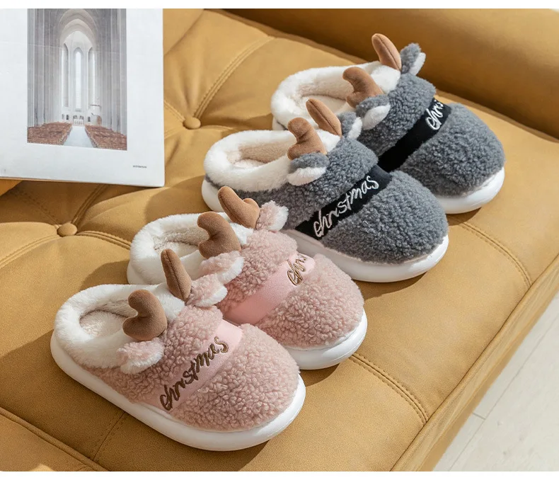Новинка 2021, тапочки с рождественским оленем на толстой подошве, женские и мужские домашние теплые тапочки, мягкие плюшевые домашние тапочки для влюбленных, зимняя обувь на платформе
