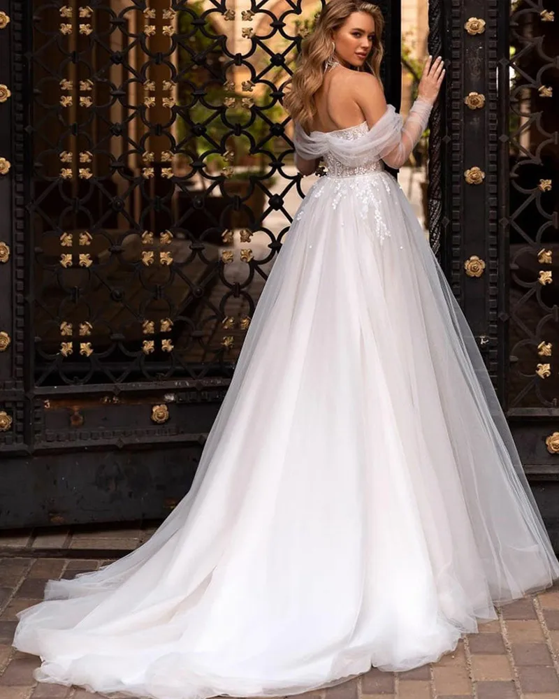 Свадебное платье с открытыми плечами и аппликацией, ТРАПЕЦИЕВИДНОЕ ...