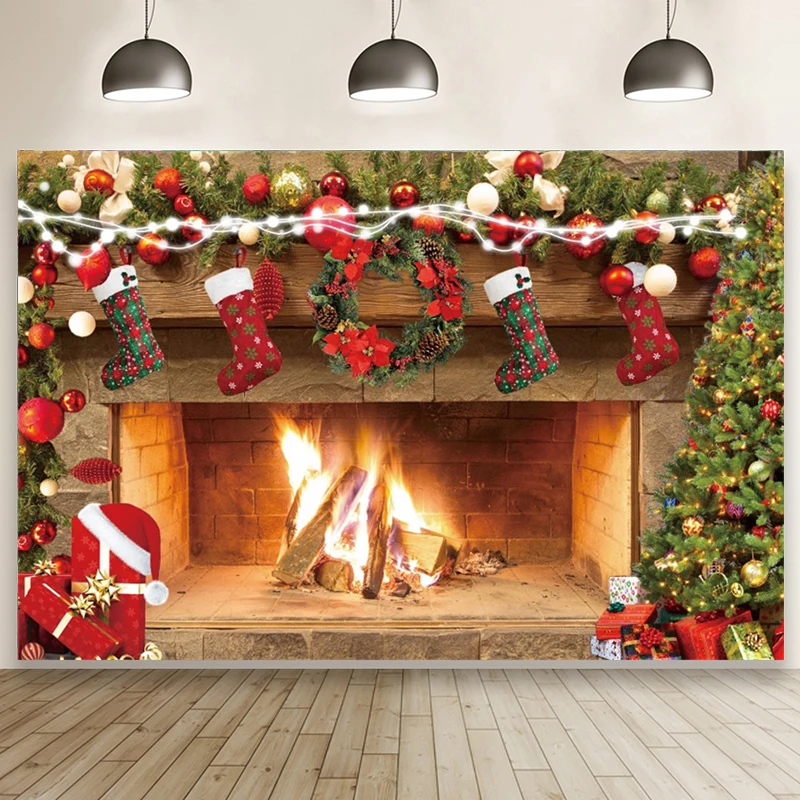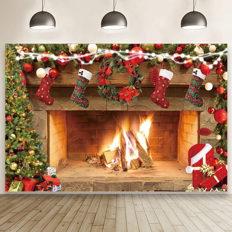 Пылающее пламя камин елка подарок шляпа носки счастливые рождественские фотографии фон на заказ фестиваль семейная студия фото фонов