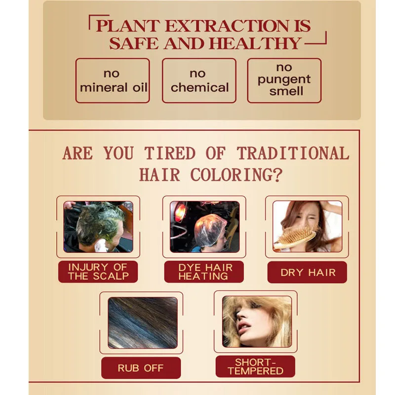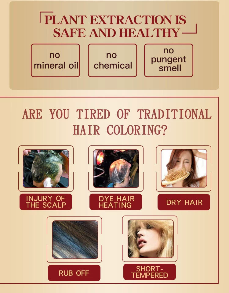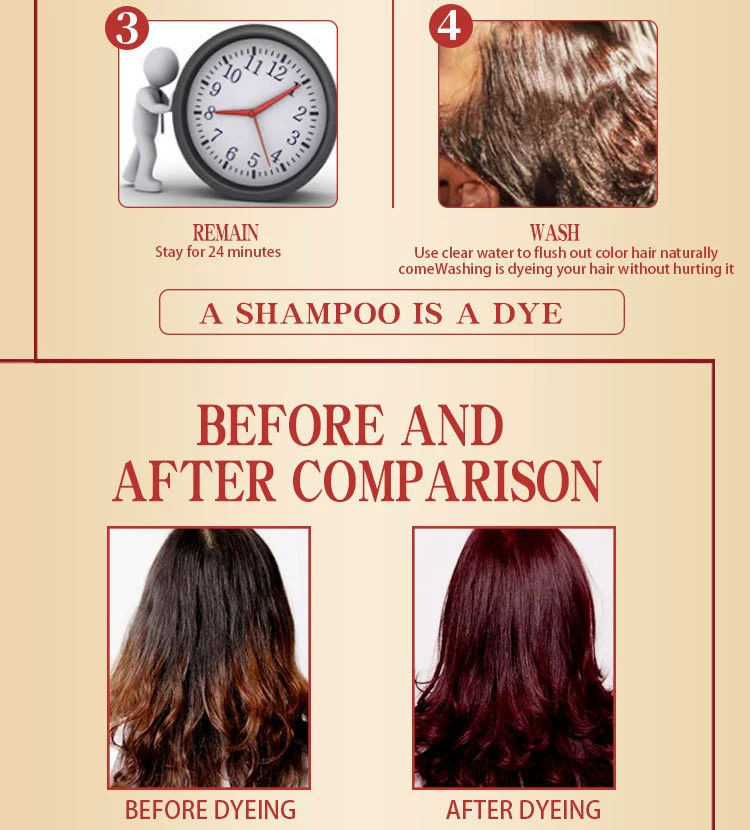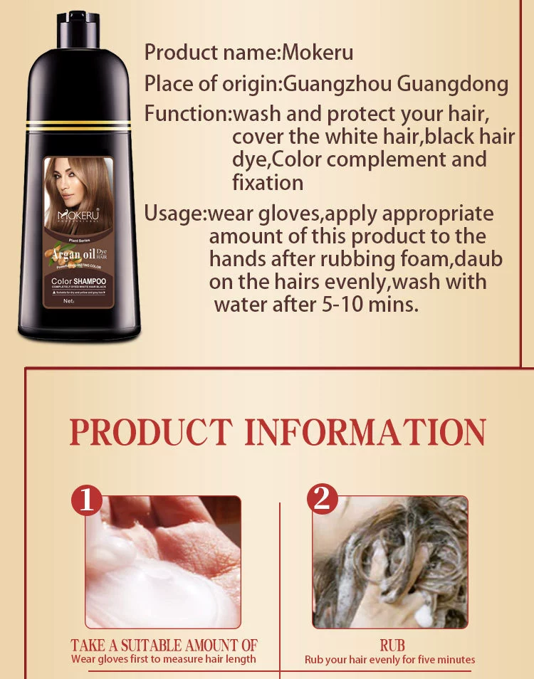 Краска для волос шампунь с использованием направления:1. Прежде чем сделать краску для волос, пожалуйста, сначала сделайте тест на кожу, если нет проблем, тогда можно начать краску для волос.2. Когда вы начинаете окрашивать волосы, убедитесь, что волосы сухие. Когда делаете краску для волос, не добавляйте воду, после того как сделали краску для волос, затем можно мыть волосы водой.3, для черного цвета, обычно требуется 5-10 минут, если другие цвета, то нужно время 30-40 минут. Затем можно мыть волосы.4, Примечание: после того, как нанесите шампунь на волосы, помассируйте его несколько минут, не царапайте гвоздь, чтобы не повредить кожу головы, пожалуйста, используйте палец для массажа волос.Mokeru Argan oil Black Hair Shampoo-это своего рода шампунь, который может покрасить волосы в черные в течение 5-25 минут и специально разработан, чтобы сделать ваши волосы черными блестящими только через обычный процесс мытья волос В ванной комнате. Аргановое масло Шампунь для черных волос. Также питает, защищает и восстанавливает кожу головы. По сравнению с традиционной краской для волос, она имеет преимущество низкой стоимости, экономит время.
