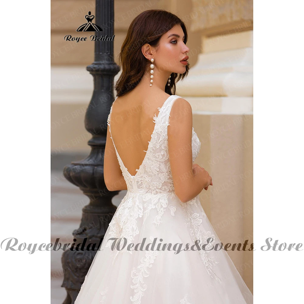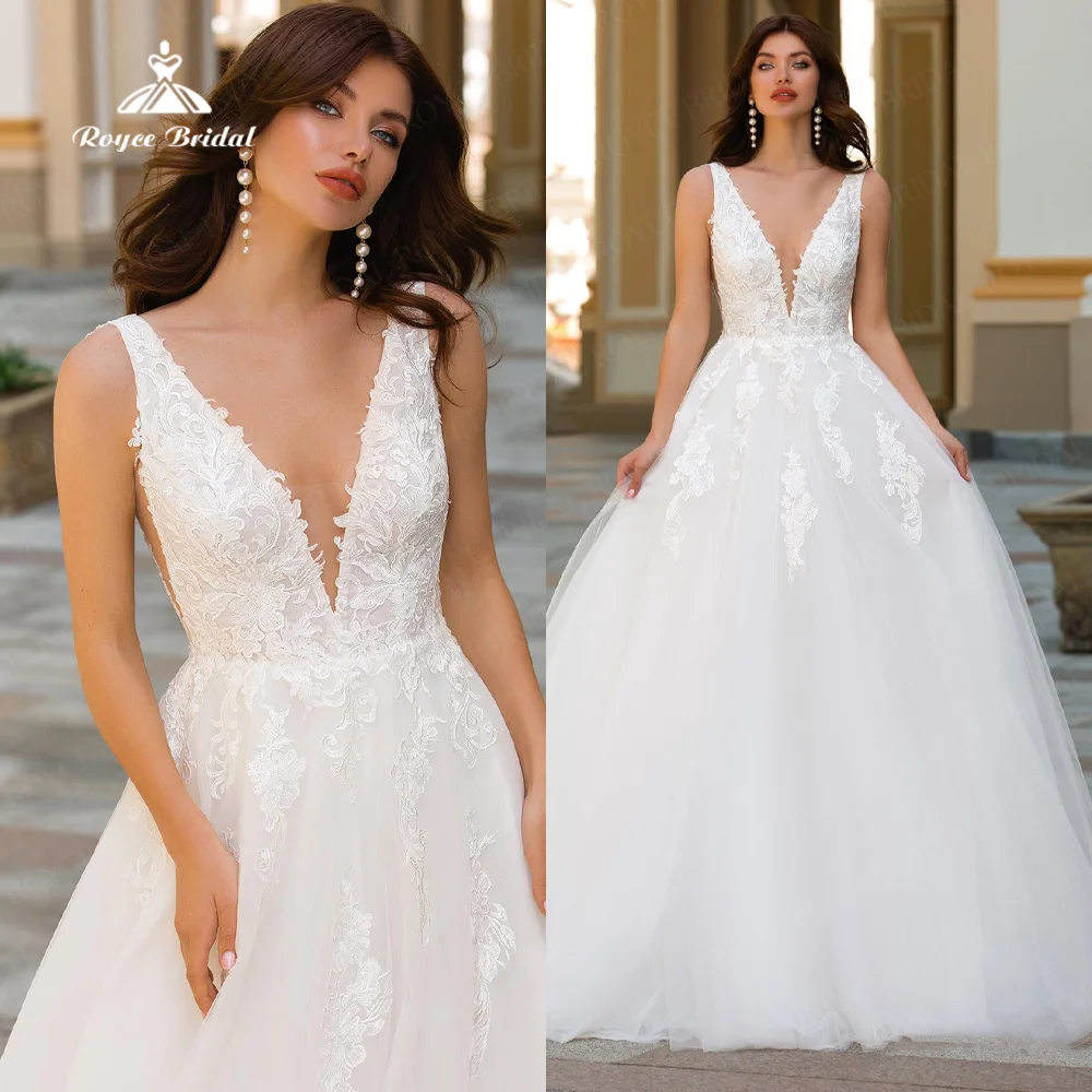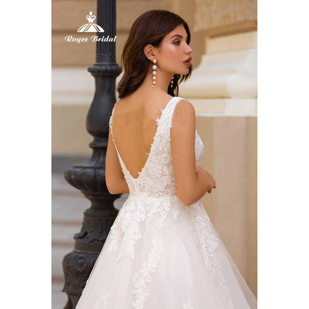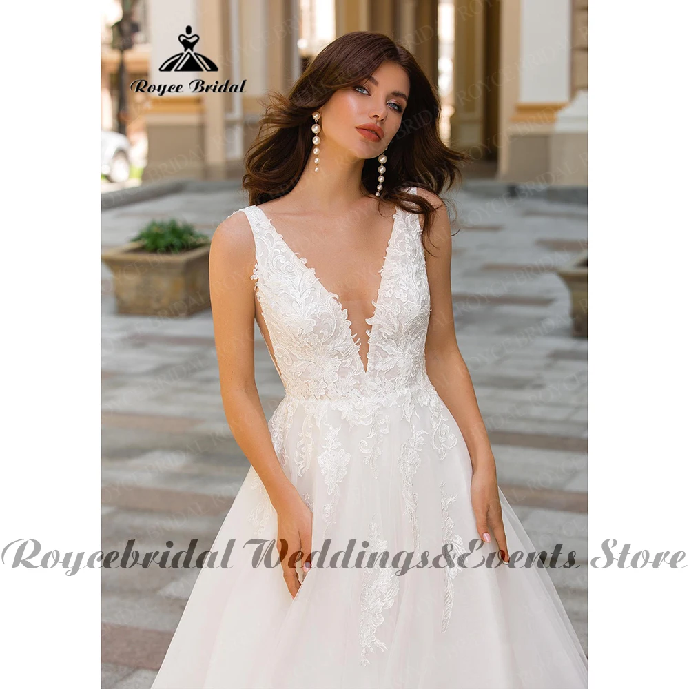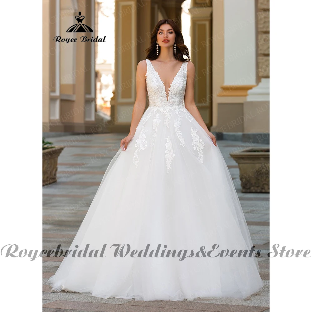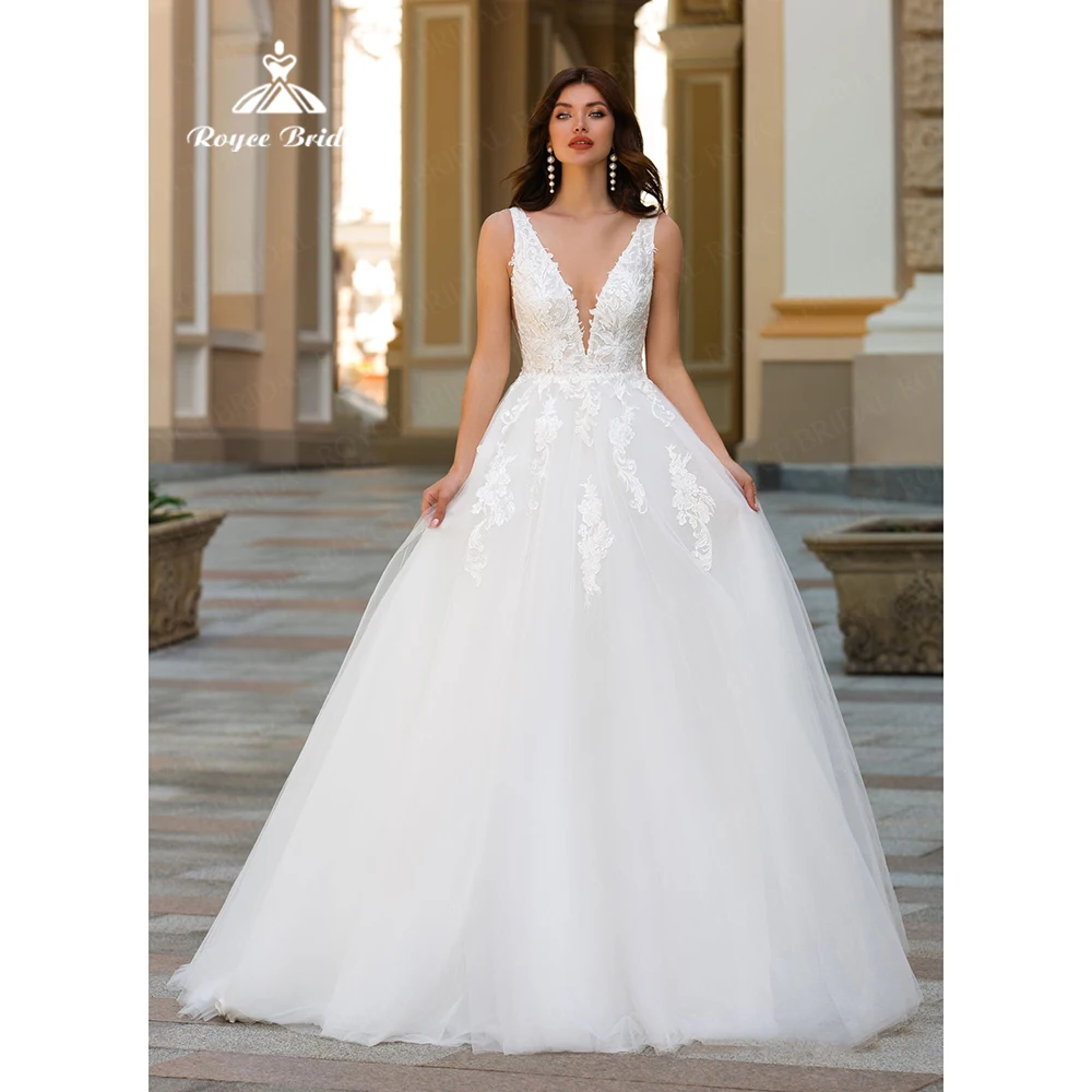 Белое свадебное платье в стиле бохо 2022 с V-образным вырезом, кружевной аппликацией и открытой спиной, тюлевые трапециевидные платья принцессы с открытой спиной, свадебные платья